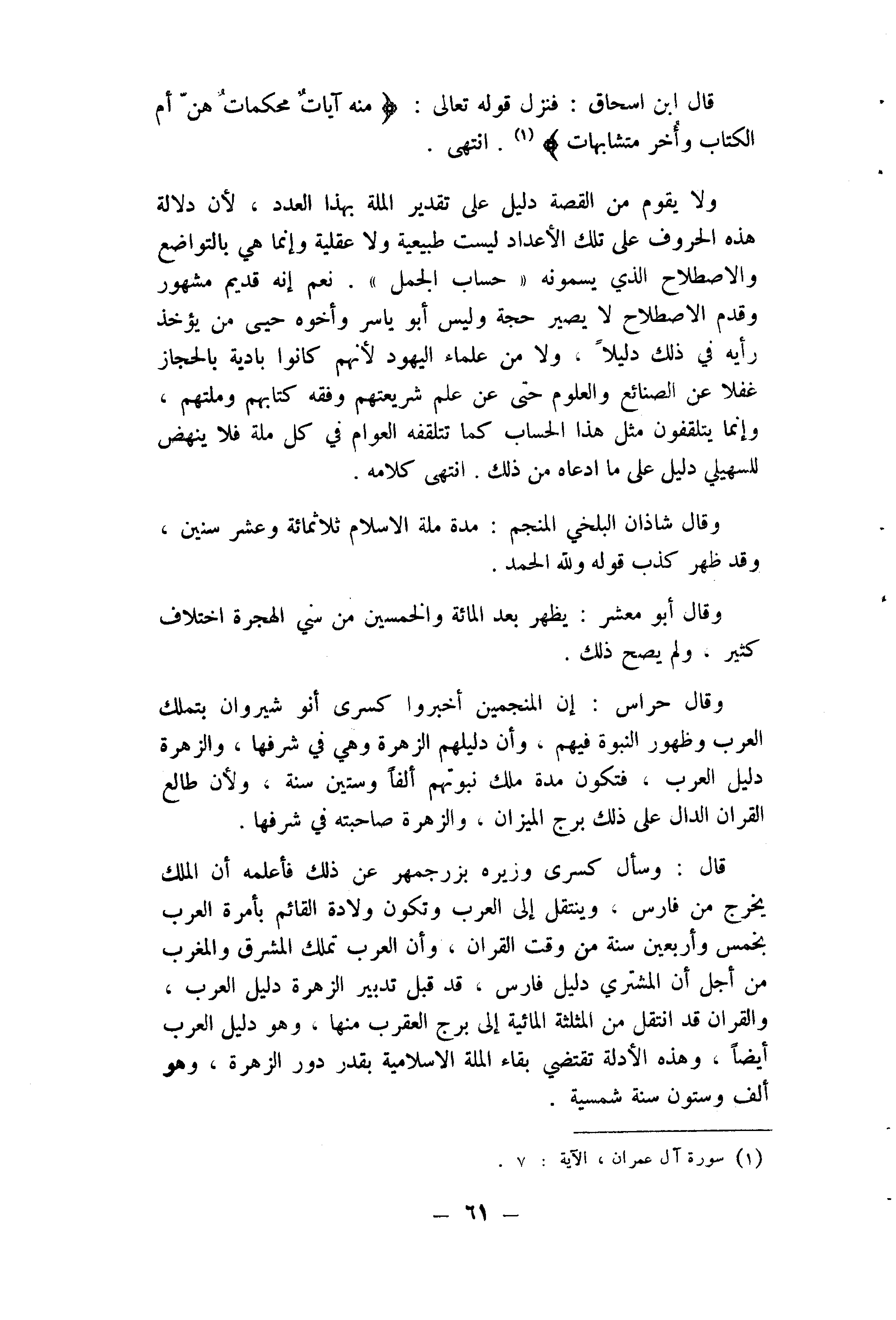 قَالَ وَسَأَلَ كسْرَى وزيره بزرجمهر عَن ذَلِك فَأعلمهُ أَن الْملك يخرج من فَارس وينتقل إِلَى الْعَرَب وَتَكون ولادَة الْقَائِم بامرة الْعَرَب بِخمْس وَأَرْبَعين سنة من وَقت الْقرَان وَأَن الْعَرَب تملك الْمشرق وَالْمغْرب من أجل أَن المُشْتَرِي دَلِيل فَارس قد قبل تَدْبِير الزهرة دَلِيل الْعَرَب وَالْقرَان قد انْتقل من الْمُثَلَّثَة المائية إِلَى برج الْعَقْرَب مِنْهَا وَهُوَ دَلِيل الْعَرَب أَيْضا وَهَذِه الْأَدِلَّة تَقْتَضِي بَقَاء الْملَّة الإسلامية بِقدر دور الزهرة وَهُوَ ألف وَسِتُّونَ سنة شمسية