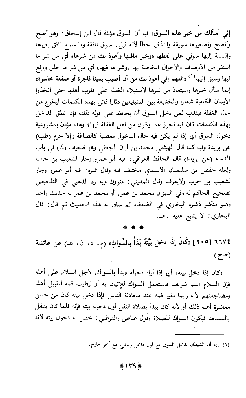 إِنِّي أَسأَلك من خير هَذِه السُّوق فِيهِ أَن السُّوق مُؤَنّثَة قَالَ ابْن إِسْحَق وَهُوَ أصح وأفصح وتصغيرها سويقة والتذكير خطأ لِأَنَّهُ قيل سوق نافقة وَمَا سمع نَافق بغَيْرهَا وَالنِّسْبَة إِلَيْهَا سوقي على لَفظهَا وَخير مَا فِيهَا وَأَعُوذ بك من شَرها أَي من شَرّ مَا اسْتَقر من الْأَوْصَاف وَالْأَحْوَال الْخَاصَّة بهَا وَشر مَا فِيهَا أَي من شَرّ مَا خلق وَوَقع فِيهَا وَسبق إِلَيْهَا اللَّهُمَّ إِنِّي أعوذ بك من أَن أُصِيب يَمِينا فاجرة أَو صَفْقَة خاسرة إِنَّمَا سَأَلَ خَيرهَا واستعاذ من شَرها لاستيلاء الْغَفْلَة على قُلُوب أَهلهَا حَتَّى أتخذوا الْأَيْمَان الكاذبة شعارا والخديعة بَين الْمُتَبَايعين دثارا فَأتى بِهَذِهِ الْكَلِمَات ليخرج من حَال الْغَفْلَة فَينْدب لمن دخل السُّوق أَن يحافظ على قَوْله ذَلِك فَإِذا نطق الدَّاخِل بِهَذِهِ الْكَلِمَات كَانَ فِيهِ تحرز عَمَّا يكون من أهل الْغَفْلَة فِيهَا وَهَذَا مُؤذن بمشروعية دُخُول السُّوق أَي إِذا لم يكن فِيهِ حَال الدُّخُول مَعْصِيّة كالصاغة وإلاحرم طب عَن بُرَيْدَة وَفِيه كَمَا قَالَ الهيثمي مُحَمَّد بن أبان الْجعْفِيّ وَهُوَ ضَعِيف ك فِي بَاب الدُّعَاء عَن بُرَيْدَة قَالَ الْحَافِظ الْعِرَاقِيّ فِيهِ أَبُو عَمْرو وجار لشعيب بن حَرْب وَلَعَلَّه حَفْص بن سُلَيْمَان الْأَسدي مُخْتَلف فِيهِ وَقَالَ غَيره فِيهِ أَبُو عَمْرو وجار لشعيب بن حَرْب وَلَا يعرف وَقَالَ الْمَدِينِيّ مَتْرُوك وَبِه رد الذَّهَبِيّ فِي التَّلْخِيص تَصْحِيح الْحَاكِم لَهُ وَفِي الْمِيزَان مُحَمَّد بن عَمْرو أَو مُحَمَّد بن عمر لَهُ حَدِيث وَاحِد وَهُوَ مُنكر ذكره البُخَارِيّ فِي الضُّعَفَاء ثمَّ سَاق لَهُ هَذَا الحَدِيث ثمَّ قَالَ قَالَ البُخَارِيّ لَا يُتَابع عَلَيْهِ اهـ