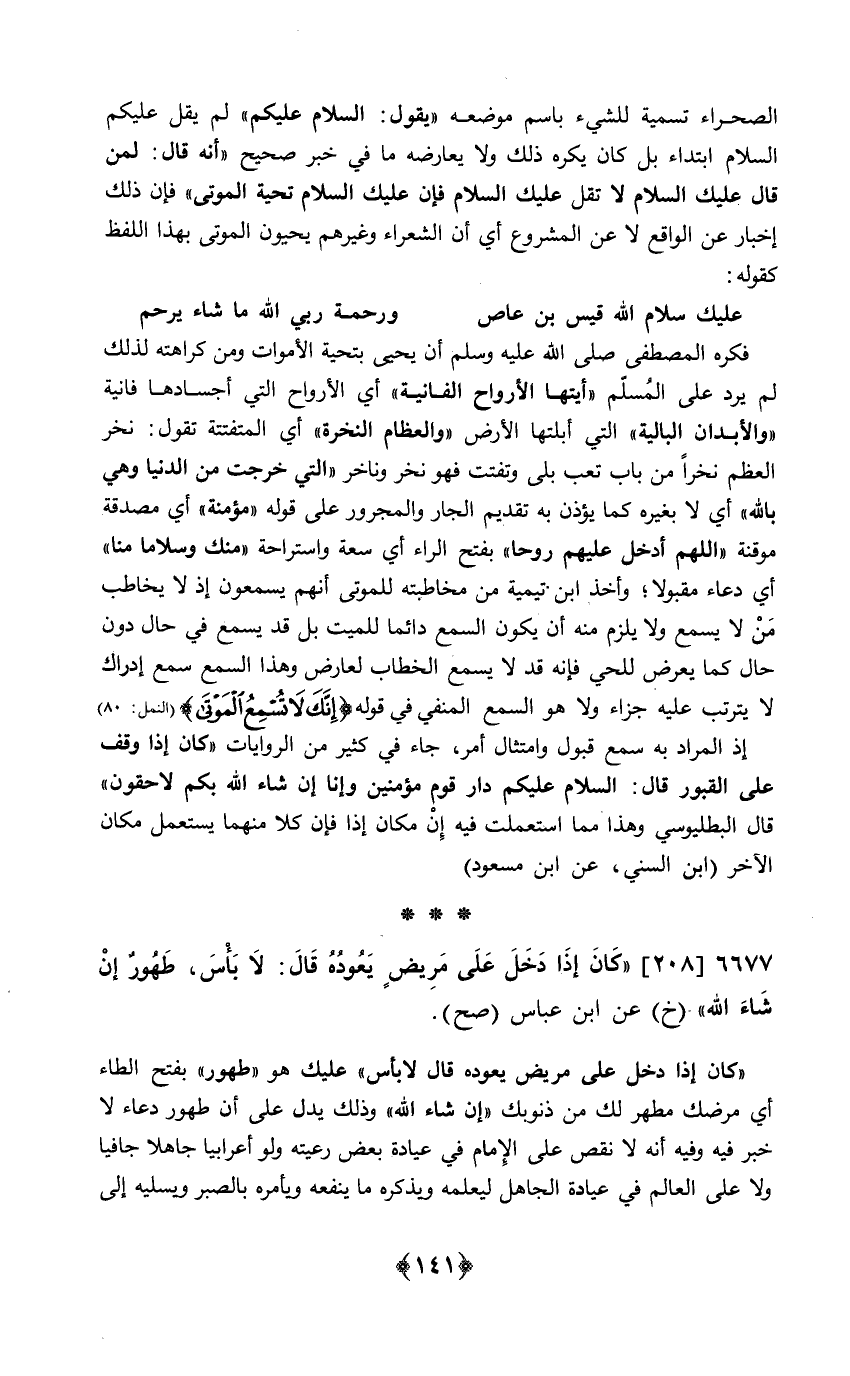 (عَلَيْك سَلام الله قيس بن عَاص ... وَرَحْمَة رَبِّي الله مَا شَاءَ يرحم) فكره الْمُصْطَفى صلى الله عَلَيْهِ وَسلم أَن يحيى بِتَحِيَّة الْأَمْوَات وَمن كَرَاهَته لذَلِك لم يرد على الْمُسلم أيتها الْأَرْوَاح الفانية أَي الْأَرْوَاح الَّتِي أجسادها فانية والأبدان البالية الَّتِي أبلتها الأَرْض وَالْعِظَام النخرة أَي المتفتتة تَقول نخر الْعظم نخرا من بَاب تَعب بلَى وتفتت فَهُوَ نخر وناخر الَّتِي خرجت من الدُّنْيَا وَهِي بِاللَّه أَي لَا بِغَيْرِهِ كَمَا يُؤذن بِهِ تَقْدِيم الْجَار وَالْمَجْرُور على قَوْله مُؤمنَة أَي مصدقة موقنة اللَّهُمَّ أَدخل عَلَيْهِم روحا بِفَتْح الرَّاء أَي سَعَة وإستراحة مِنْك وَسلَامًا منا أَي دُعَاء مَقْبُولًا وَأخذ ابْن تَيْمِية من مخاطبته للموتى أَنهم يسمعُونَ إِذْ لَا يُخَاطب من لَا يسمع وَلَا يلْزم مِنْهُ أَن يكون السّمع دَائِما للْمَيت بل قد يسمع فِي حَال دون حَال كَمَا يعرض للحي فَإِنَّهُ قد لَا يسمع الْخطاب لعَارض وَهَذَا السّمع سمع إِدْرَاك لَا يَتَرَتَّب عَلَيْهِ جَزَاء وَلَا هُوَ السّمع الْمَنْفِيّ فِي قَوْله {إِنَّك لَا تسمع الْمَوْتَى} إِذْ المُرَاد بِهِ سمع قبُول وامتثال أمره جَاءَ فِي كثير من الرِّوَايَات كَانَ إِذا وقف على الْقُبُور قَالَ السَّلَام عَلَيْكُم دَار قوم مُؤمنين وَإِنَّا إِن شَاءَ الله بكم لَا حقون قَالَ البطليوسي وَهَذَا مِمَّا اسْتعْملت فِيهِ إِن مَكَان إِذا فَإِن كلا مِنْهُمَا يسْتَعْمل مَكَان الآخر ابْن السّني عَن ابْن مَسْعُود