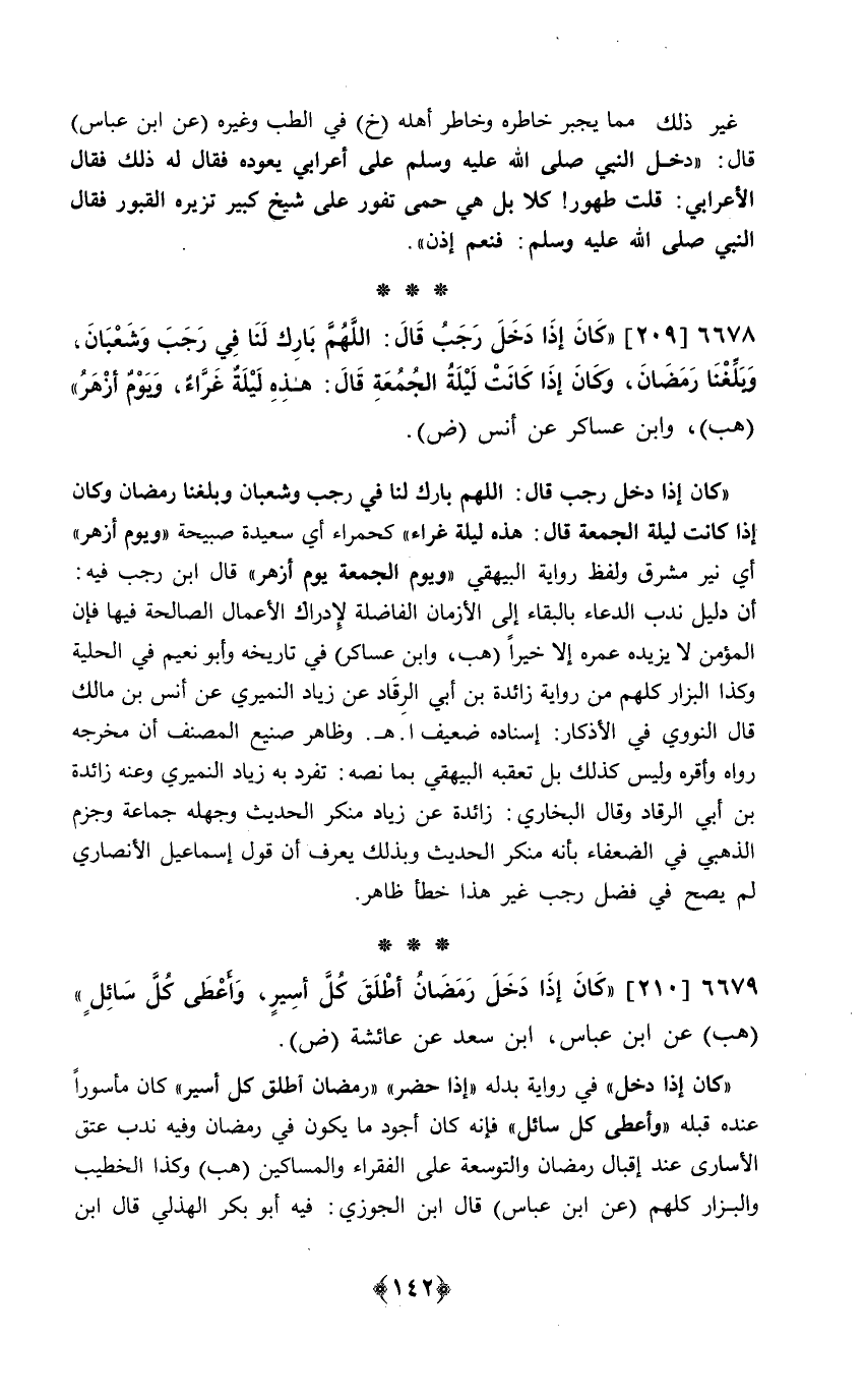 كَانَ إِذا دخل رَجَب قَالَ اللَّهُمَّ بَارك لنا فِي رَجَب وَشَعْبَان وبلغنا رَمَضَان وَكَانَ إِذا كَانَت لَيْلَة الْجُمُعَة قَالَ هَذِه لَيْلَة غراء كحمراء أَي سعيدة صَبِيحَة وَيَوْم أَزْهَر أَي نير مشرق وَلَفظ رِوَايَة الْبَيْهَقِيّ وَيَوْم الْجُمُعَة يَوْم أَزْهَر قَالَ ابْن رَجَب فِيهِ أَن دَلِيل ندب الدُّعَاء بِالْبَقَاءِ إِلَى الْأَزْمَان الفاضلة لإدراك الْأَعْمَال الصَّالِحَة فِيهَا فَإِن الْمُؤمن لَا يزِيدهُ عمره إِلَّا خيرا هَب وَابْن عَسَاكِر فِي تَارِيخه وَأَبُو نعيم فِي الْحِلْية وَكَذَا الْبَزَّار كلهم من رِوَايَة زَائِدَة بن أبي الرقاد عَن زِيَاد النميري عَن أنس بن مَالك قَالَ النَّوَوِيّ فِي الْأَذْكَار إِسْنَاده ضَعِيف اهـ وَظَاهر صَنِيع المُصَنّف أَن مخرجه رَوَاهُ وَأقرهُ وَلَيْسَ كَذَلِك بل تعقبه الْبَيْهَقِيّ بِمَا نَصه تفرد بِهِ زِيَاد النميري وَعنهُ زَائِدَة بن أبي الرقاد وَقَالَ البُخَارِيّ زَائِدَة عَن زِيَاد مُنكر الحَدِيث وجهله جمَاعَة وَجزم الذَّهَبِيّ فِي الضُّعَفَاء بِأَنَّهُ مُنكر الحَدِيث وَبِذَلِك يعرف أَن قَول إِسْمَاعِيل الْأنْصَارِيّ لم يَصح فِي فضل رَجَب غير هَذَا خطأ ظَاهر