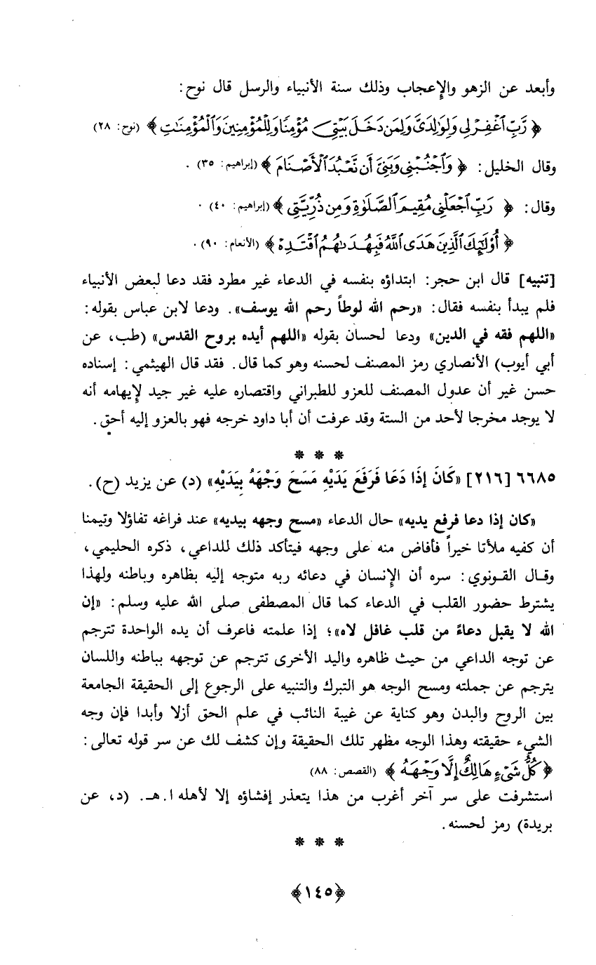 كَانَ إِذا دَعَا فَرفع يَدَيْهِ حَال الدُّعَاء مسح وَجهه بيدَيْهِ عِنْد فَرَاغه تفاؤلا وتيمنا أَن كفيه ملأتا خيرا فَأَفَاضَ مِنْهُ على وَجهه فيتأكد ذَلِك للداعي ذكره الْحَلِيمِيّ وَقَالَ القونوي سره أَن الْإِنْسَان فِي دُعَائِهِ ربه مُتَوَجّه إِلَيْهِ بِظَاهِرِهِ وباطنه وَلِهَذَا يشْتَرط حُضُور الْقلب فِي الدُّعَاء كَمَا قَالَ الْمُصْطَفى صلى الله عَلَيْهِ وَسلم إِن الله لَا يقبل دُعَاء من قلب غافل لاه إِذا عَلمته فاعرف أَن يَده الْوَاحِدَة تترجم عَن توجه الدَّاعِي من حَيْثُ طاهره وَالْيَد الْأُخْرَى تترجم عَن توجهه بباطنه وَاللِّسَان يترجم عَن جملَته وَمسح الْوَجْه هُوَ التَّبَرُّك والتنبيه على الرُّجُوع إِلَى الْحَقِيقَة الجامعة بَين الرّوح وَالْبدن وَهُوَ كِنَايَة عَن غيبَة النَّائِب فِي علم الْحق أزلا وأبدا فَإِن وَجه الشَّيْء حَقِيقَته وَهَذَا الْوَجْه مظهر تِلْكَ الْحَقِيقَة وَإِن كشف لَك عَن سر قَوْله تَعَالَى كل شئ هَالك وَجهه