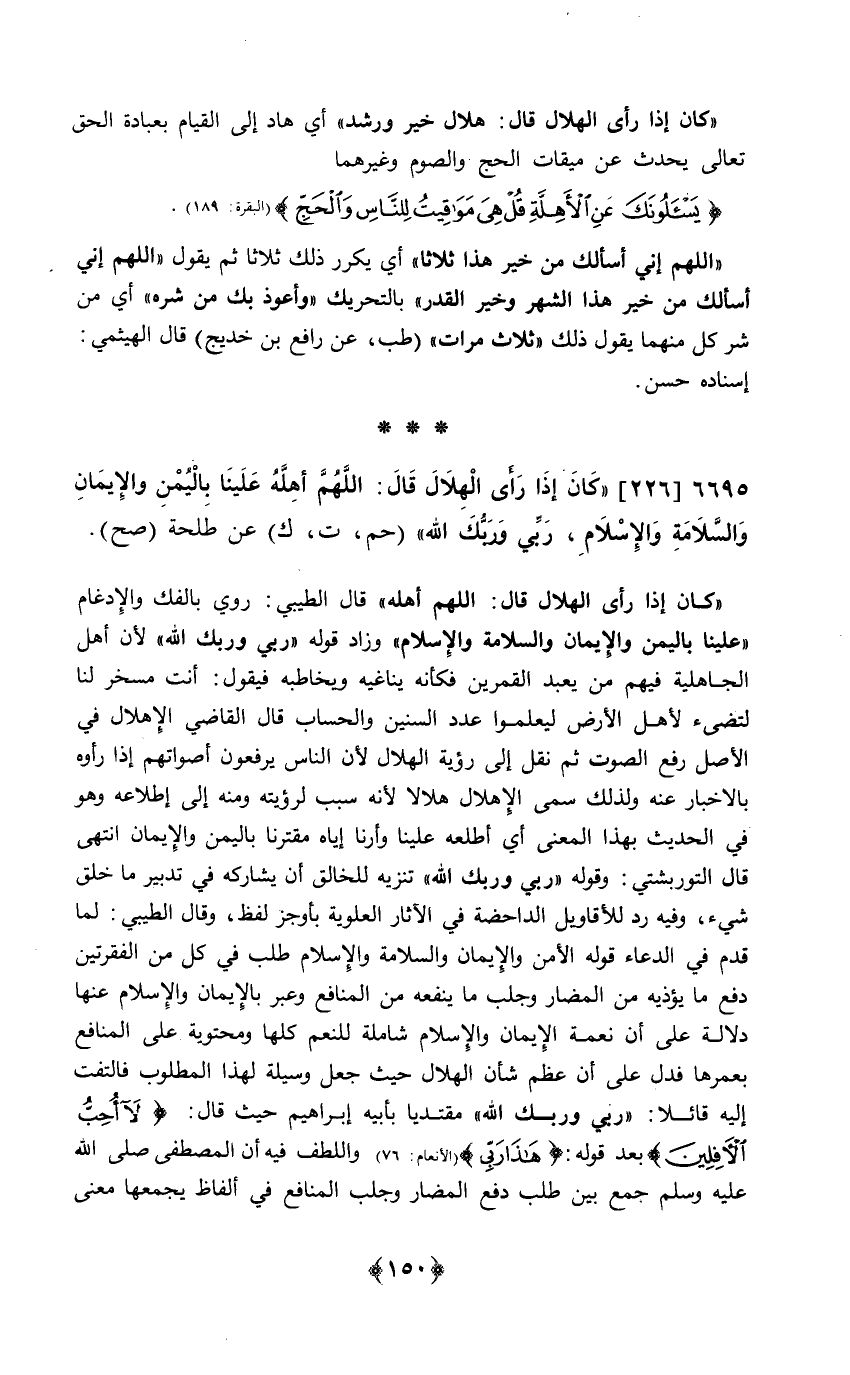 (كَانَ إِذا رأى الْهلَال قَالَ اللَّهُمَّ أَهله قَالَ الطَّيِّبِيّ رُوِيَ بالفك والإدغام علينا بِالْيمن وَالْإِيمَان والسلامة وَالْإِسْلَام وَزَاد قَوْله رَبِّي وَرَبك الله لِأَن أهل الْجَاهِلِيَّة فيهم من يعبد القمرين فَكَأَنَّهُ يناغيه ويخاطبه فَيَقُول أَنْت مسخر لنا لتضيء لأهل الأَرْض ليعلموا عدد السنين والحساب قَالَ القَاضِي الإهلال فِي الأَصْل رفع الصَّوْت ثمَّ نقل إِلَى رُؤْيَة الْهلَال لِأَن النَّاس يرفعون أَصْوَاتهم إِذا رَأَوْهُ بالأخبار عَنهُ وَلذَلِك سمي الإهلال هلالا لِأَنَّهُ سَبَب لرُؤْيَته وَمِنْه إِلَى إطلاعه وَهُوَ فِي الحَدِيث بِهَذَا الْمَعْنى أَي أطلعه علينا وأرنا إِيَّاه مقترنا بِالْيمن وَالْإِيمَان انْتهى قَالَ التوربشتي وَقَوله رَبِّي وَرَبك الله تَنْزِيه للخالق أَن يُشَارِكهُ فِي تَدْبِير مَا خلق شَيْء وَفِيه رد للأقاويل الداحضة فِي الْآثَار العلوية بأوجز لفظ وَقَالَ الطَّيِّبِيّ لما قدم فِي الدُّعَاء قَوْله الْأَمْن وَالْإِيمَان والسلامة وَالْإِسْلَام طلب فِي كل من الفقرتين دفع مَا يُؤْذِيه من المضار وجلب مَا يَنْفَعهُ من الْمَنَافِع وَعبر بِالْإِيمَان وَالْإِسْلَام عَنْهَا دلَالَة على أَن نعْمَة الْإِيمَان وَالْإِسْلَام شَامِلَة للنعم كلهَا ومحتوية على الْمَنَافِع بعمرها فَدلَّ على أَن عظم شَأْن الْهلَال حَيْثُ جعل وَسِيلَة لهَذَا الْمَطْلُوب فَالْتَفت إِلَيْهِ قَائِلا رَبِّي وَرَبك الله مقتديا بِأَبِيهِ إِبْرَاهِيم حَيْثُ قَالَ {لَا أحب الآفلين} بعد قَوْله {هَذَا رَبِّي} واللطف فِيهِ أَن الْمُصْطَفى صلى الله عَلَيْهِ وَسلم جمع بَين طلب دفع المضار وجلب الْمَنَافِع فِي أَلْفَاظ يجمعها معنى