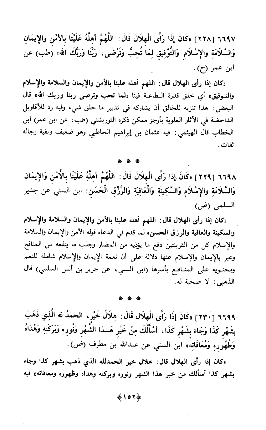 230 - (كَانَ إِذا رأى الْهلَال قَالَ هِلَال خير الْحَمد لله الَّذِي ذهب بِشَهْر كَذَا وَجَاء بِشَهْر كَذَا أَسأَلك من خير هَذَا الشَّهْر ونوره وبركته وهداه وَطهُوره ومعافاته) ابْن السّني عَن عبد الله بن مطرف ض