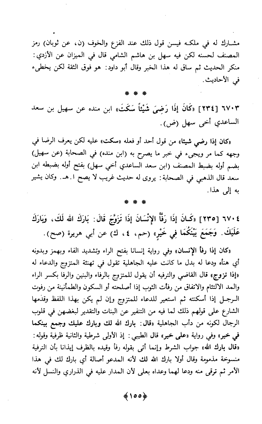 235 - (كَانَ إِذا رفأ الْإِنْسَان إِذا تزوج قَالَ بَارك الله لَك وَبَارك عَلَيْك وَجمع بَيْنكُمَا فِي خير) حم 4 ك عَن أبي هُرَيْرَة // صَحَّ //