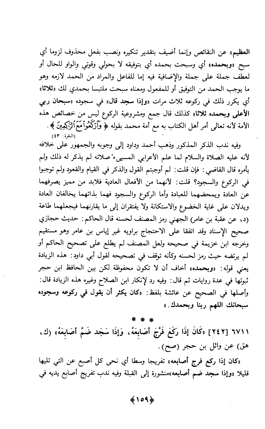 الْعَظِيم عَن النقائص وَإِنَّمَا أضيف بِتَقْدِير تنكيره وَنصب بِفعل مَحْذُوف لُزُوما أَي سبح وَبِحَمْدِهِ أَي وسبحت بِحَمْدِهِ أَي بتوفيقه لَا بحولي وقوتي وَالْوَاو للْحَال أَو لعطف جملَة على جملَة والإضافية فبه إِمَّا للْفَاعِل وَالْمرَاد من الْحَمد لَازمه وَهُوَ مَا يُوجب الْحَمد من التَّوْفِيق أَو للْمَفْعُول وَمَعْنَاهُ سبحت ملتبسا بحمدي لَك ثَلَاثًا أَي يُكَرر ذَلِك فِي رُكُوعه ثَلَاث مَرَّات وَإِذا سجد قَالَ فِي سُجُوده سُبْحَانَ رَبِّي الْأَعْلَى وَبِحَمْدِهِ ثَلَاثًا كَذَلِك قَالَ جمع ومشروعية الرُّكُوع لَيْسَ من خَصَائِص هَذِه الْأمة لِأَنَّهُ تَعَالَى أَمر أهل الْكتاب بِهِ مَعَ أمة مُحَمَّد بقوله واركعوا مَعَ الركعين