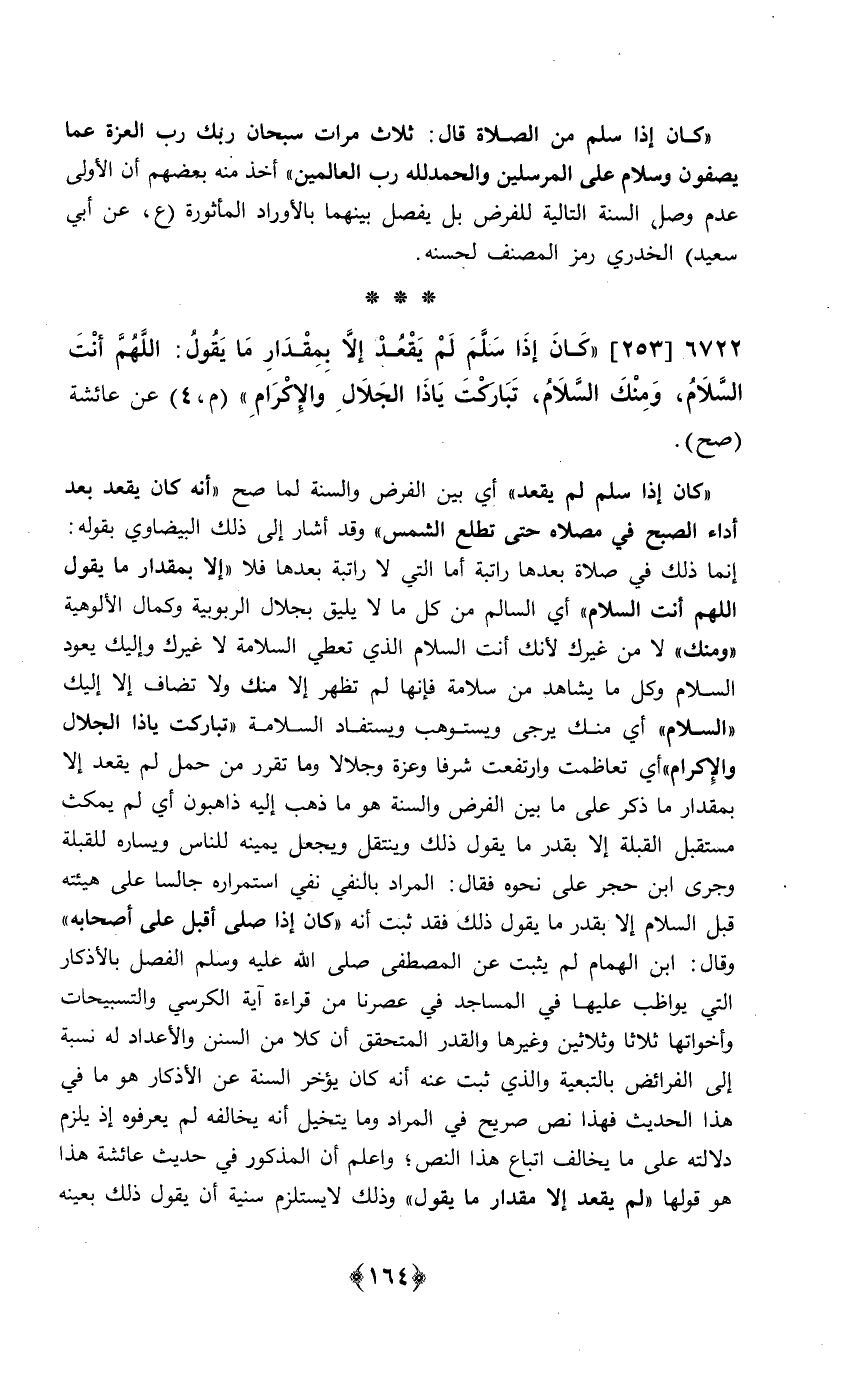 253 - (كَانَ إِذا سلم لم يقْعد إِلَّا بِمِقْدَار مَا يَقُول اللَّهُمَّ أَنْت السَّلَام ومنك السَّلَام تَبَارَكت يَا ذَا الْجلَال وَالْإِكْرَام) م 4 عَن عَائِشَة // صَحَّ //