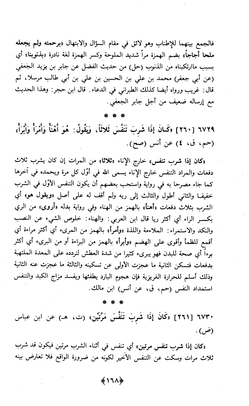260 - كَانَ إِذا شرب تنفس ثَلَاثًا وَيَقُول هُوَ أهنأ وأمرأ وَأَبْرَأ حم ق 4 عَن أنس // صَحَّ //