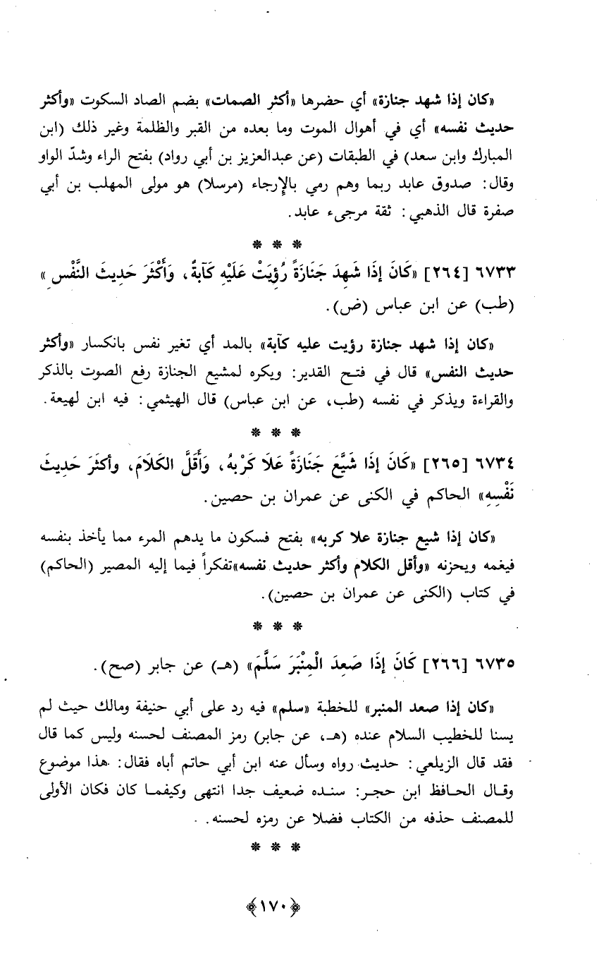 265 - (كَانَ إِذا شيع جَنَازَة علا كربه وَأَقل الْكَلَام وَأكْثر حَدِيث نَفسه الْحَاكِم فِي الكنى عَن عمرَان بن حُصَيْن