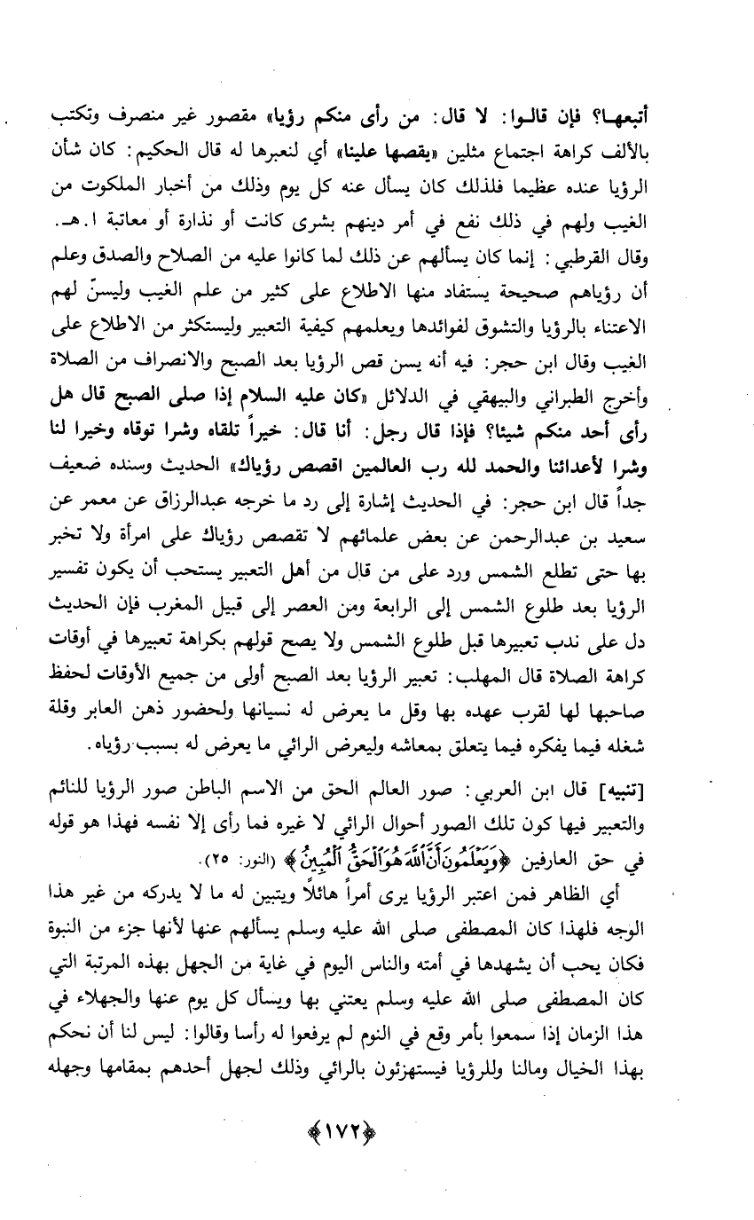 أتبعهَا فَإِن قَالُوا لَا قَالَ من رأى مِنْكُم رُؤْيا مَقْصُور غير منصرف وتكتب بِالْألف كَرَاهَة اجْتِمَاع مثلين يقصها علينا أَي لنعبرها لَهُ قَالَ الْحَكِيم كَانَ شَأْن الرُّؤْيَا عِنْده عَظِيما فَلذَلِك كَانَ يسْأَل عَنهُ كل يَوْم وَذَلِكَ من أَخْبَار الملكوت من الْغَيْب وَلَهُم فِي ذَلِك نفع فِي أَمر دينهم بشرى كَانَت أَو نذارة أَو معاتبة اهـ وَقَالَ الْقُرْطُبِيّ إِنَّمَا كَانَ يسألهم عَن ذَلِك لما كَانُوا عَلَيْهِ من الصّلاح والصدق وَعلم أَن رؤياهم صَحِيحَة يُسْتَفَاد مِنْهَا الِاطِّلَاع على كثير من علم الْغَيْب وليسن لَهُم الاعتناء بالرؤيا والتشوق لفوائدها وَيُعلمهُم كَيْفيَّة التَّعْبِير وليستكثر من الِاطِّلَاع على الْغَيْب وَقَالَ ابْن حجر فِيهِ أَنه يسن قصّ الرُّؤْيَا بعد الصُّبْح والانصراف من الصَّلَاة وَأخرج الطَّبَرَانِيّ وَالْبَيْهَقِيّ فِي الدَّلَائِل كَانَ عَلَيْهِ السَّلَام إِذا صلى الصُّبْح قَالَ هَل رأى أحد مِنْكُم شَيْئا فَإِذا قَالَ رجل أَنا قَالَ خيرا تَلقاهُ وشرا توقاه وَخيرا لنا وشرا لأعدائنا وَالْحَمْد لله رب الْعَالمين اقصص رُؤْيَاك الحَدِيث // وَسَنَده ضَعِيف // جدا قَالَ ابْن حجر فِي الحَدِيث إِشَارَة إِلَى رد مَا خرجه عبد الرَّزَّاق عَن معمر عَن سعيد بن عبد الرَّحْمَن عَن بعض عُلَمَائهمْ لَا تقصص رُؤْيَاك على امْرَأَة وَلَا تخبر بهَا حَتَّى تطلع الشَّمْس ورد على من قَالَ من أهل التَّعْبِير يسْتَحبّ أَن يكون تَفْسِير الرُّؤْيَا بعد طُلُوع الشَّمْس إِلَى الرَّابِعَة وَمن الْعَصْر إِلَى قبيل الْمغرب فَإِن الحَدِيث دلّ على ندب تعبيرها قبل طُلُوع الشَّمْس وَلَا يَصح قَوْلهم بِكَرَاهَة تعبيرها فِي أَوْقَات كَرَاهَة الصَّلَاة قَالَ الْمُهلب تَعْبِير الرُّؤْيَا بعد الصُّبْح أولى من جَمِيع الْأَوْقَات لحفظ صَاحبهَا لَهَا لقرب عَهده بهَا وَقل مَا يعرض لَهُ نسيانها ولحضور ذهن العابر وَقلة شغلة فِيمَا يفكره يتَعَلَّق بمعاشه وليعرض الرَّائِي مَا يعرض لَهُ بِسَبَب رُؤْيَاهُ