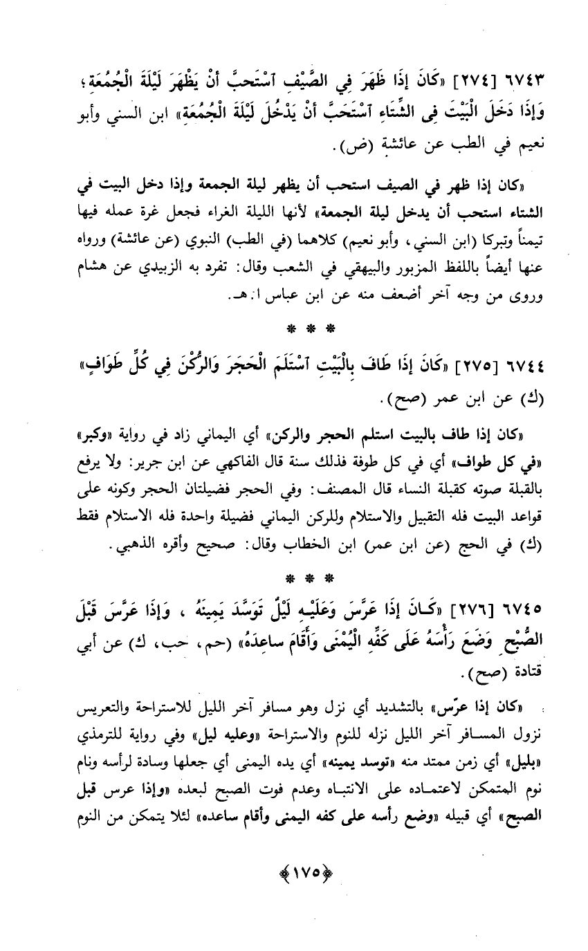 كَانَ إِذا ظهر فِي الصَّيف اسْتحبَّ أَن يظْهر لَيْلَة الْجُمُعَة وَإِذا دخل الْبَيْت فِي الشتَاء اسْتحبَّ أَن يدْخل لَيْلَة الْجُمُعَة لِأَنَّهَا اللَّيْلَة الغراء فَجعل غرَّة عمله فِيهَا تيمنا وتبركا ابْن السّني وَأَبُو نعيم كِلَاهُمَا فِي الطِّبّ النَّبَوِيّ عَن عَائِشَة وَرَوَاهُ عَنْهَا أَيْضا بِاللَّفْظِ الْمَزْبُور وَالْبَيْهَقِيّ فِي الشّعب وَقَالَ تفرد بِهِ الزبيدِيّ عَن هِشَام وروى من وَجه آخر أَضْعَف مِنْهُ عَن ابْن عَبَّاس اهـ