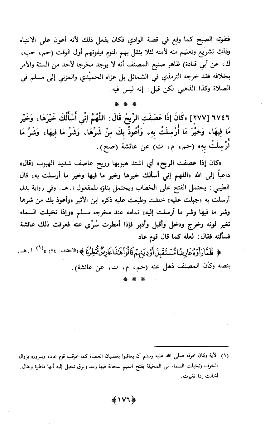277 - (كَانَ إِذا عصفت الرّيح قَالَ اللَّهُمَّ إِنِّي أَسأَلك خَيرهَا وَخير مَا فِيهَا وَخير مَا أرْسلت بِهِ وَأَعُوذ بك من شَرها وَشر مَا فِيهَا وَشر مَا أرْسلت بِهِ حم م ت عَن عَائِشَة // صَحَّ //
