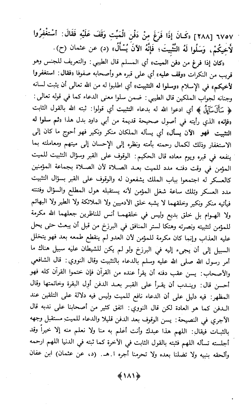288 - كَانَ إِذا فرغ من دفن الْمَيِّت وقف عَلَيْهِ فَقَالَ اسْتَغْفرُوا لأخيكم وسلموا لَهُ التثبيت فَإِنَّهُ الْآن يسْأَل د عَن عُثْمَان ح