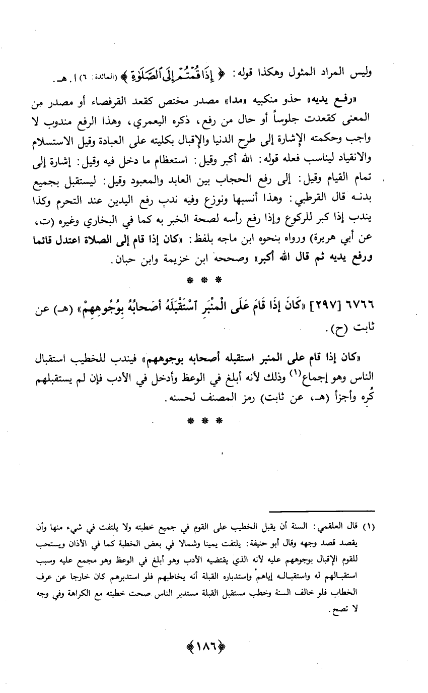كَانَ إِذا قَامَ على الْمِنْبَر استقبله أَصْحَابه بِوُجُوهِهِمْ فَينْدب للخطيب اسْتِقْبَال النَّاس وَهُوَ إِجْمَاع وَذَلِكَ لِأَنَّهُ أبلغ فِي الْوَعْظ وَأدْخل فِي الْأَدَب فَإِن لم يستقبلهم كره وأجزأ هـ عَن ثَابت رمز المُصَنّف لحسنه