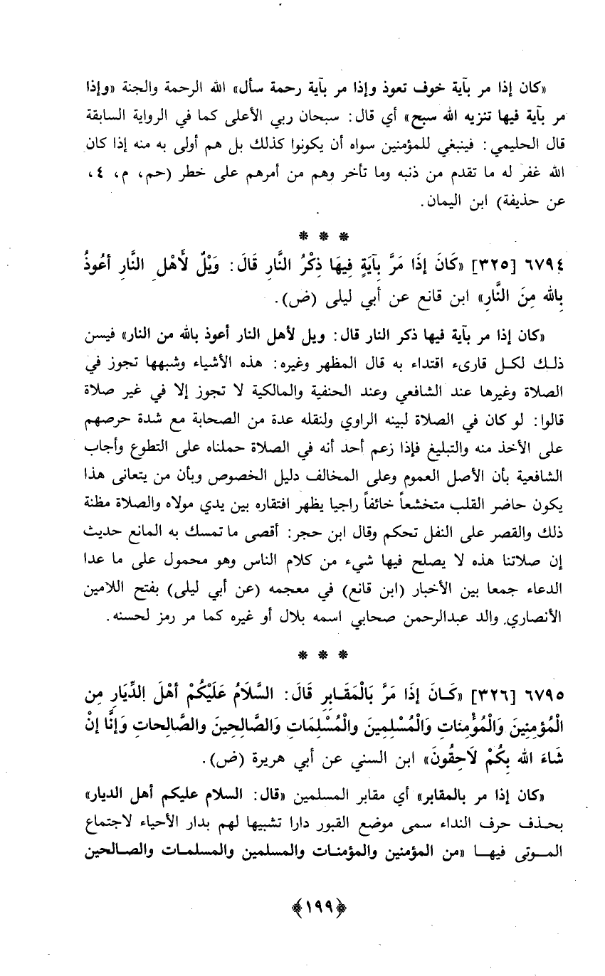 كَانَ إِذا مر بِآيَة فِيهَا ذكر النَّار قَالَ ويل لأهل النَّار أعوذ بِاللَّه من النَّار فَيسنّ ذَلِك لكل قَارِئ اقْتِدَاء بِهِ قَالَ الْمظهر وَغَيره هَذِه الْأَشْيَاء وَشبههَا تجوز فِي الصَّلَاة وَغَيرهَا عِنْد الشَّافِعِي وَعند الْحَنَفِيَّة والمالكية لَا تجوز إِلَّا فِي غير صَلَاة قَالُوا لَو كَانَ فِي الصَّلَاة لبينه الرَّاوِي ولنقله عدَّة من الصَّحَابَة مَعَ شدَّة حرصهم على الْأَخْذ مِنْهُ والتبليغ فَإِذا زعم أحد أَنه فِي الصَّلَاة حملناه على التَّطَوُّع وَأجَاب الشَّافِعِيَّة بِأَن الأَصْل الْعُمُوم وعَلى الْمُخَالف دَلِيل الْخُصُوص وَبِأَن من يتعانى هَذَا يكون حَاضر الْقلب متخشعا خَائفًا راجيا يظْهر افتقاره بَين يَدي مَوْلَاهُ وَالصَّلَاة مَظَنَّة ذَلِك وَالْقصر على النَّفْل تحكم وَقَالَ ابْن حجر أقْصَى مَا تمسك بِهِ الْمَانِع حَدِيث إِن صَلَاتنَا هَذِه لَا يصلح فِيهَا شَيْء من كَلَام النَّاس وَهُوَ مَحْمُول على مَا عدا الدُّعَاء جمعا بَين الْأَخْبَار ابْن قَانِع فِي مُعْجَمه عَن أبي ليلى بِفَتْح اللامين الْأنْصَارِيّ وَالِد عبد الرَّحْمَن صَحَابِيّ اسْمه بِلَال اَوْ غَيره كَمَا مر رمز لحسنه