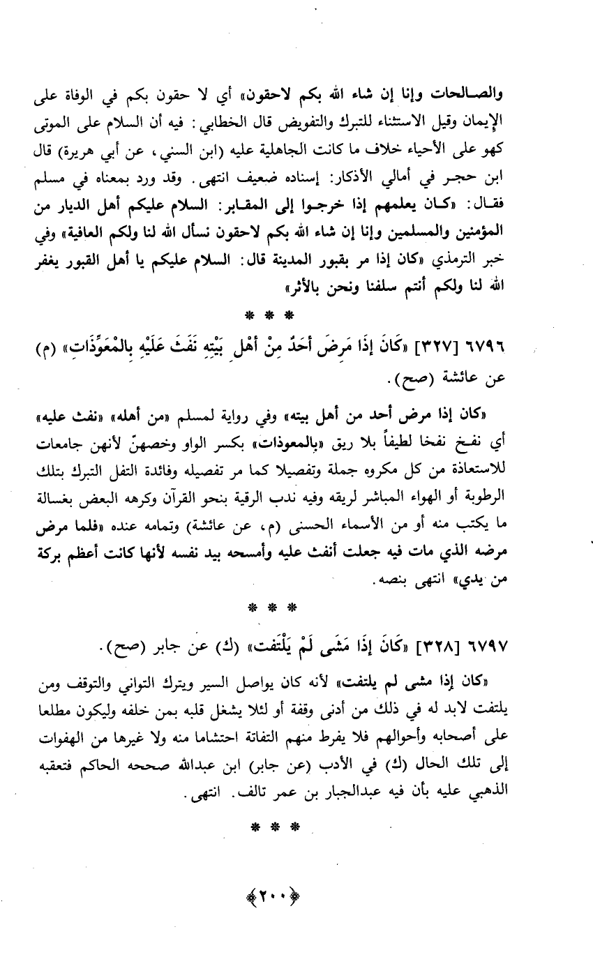 والصالحات وَإِنَّا إِن شَاءَ الله بكم لاحقون أَي لَا حقون بكم فِي الْوَفَاة على الْإِيمَان وَقيل الِاسْتِثْنَاء للتبرك والتفويض قَالَ الْخطابِيّ فِيهِ أَن السَّلَام على الْمَوْتَى كَهُوَ على الْأَحْيَاء خلاف مَا كَانَت الْجَاهِلِيَّة عَلَيْهِ ابْن السّني عَن أبي هُرَيْرَة قَالَ ابْن حجر فِي امالي الْأَذْكَار // إِسْنَاده ضَعِيف // انْتهى وَقد ورد بِمَعْنَاهُ فِي مُسلم فَقَالَ كَانَ يعلمهُمْ إِذا خَرجُوا إِلَى الْمَقَابِر السَّلَام عَلَيْكُم أهل الديار من الْمُؤمنِينَ وَالْمُسْلِمين وَإِنَّا إِن شَاءَ الله بكم لاحقون نسْأَل الله لنا وَلكم الْعَافِيَة وَفِي خبر التِّرْمِذِيّ كَانَ إِذا مر بقبور الْمَدِينَة السَّلَام عَلَيْكُم يَا أهل الْقُبُور يغْفر الله لنا وَلكم أَنْتُم سلفنا وَنحن بالأثر