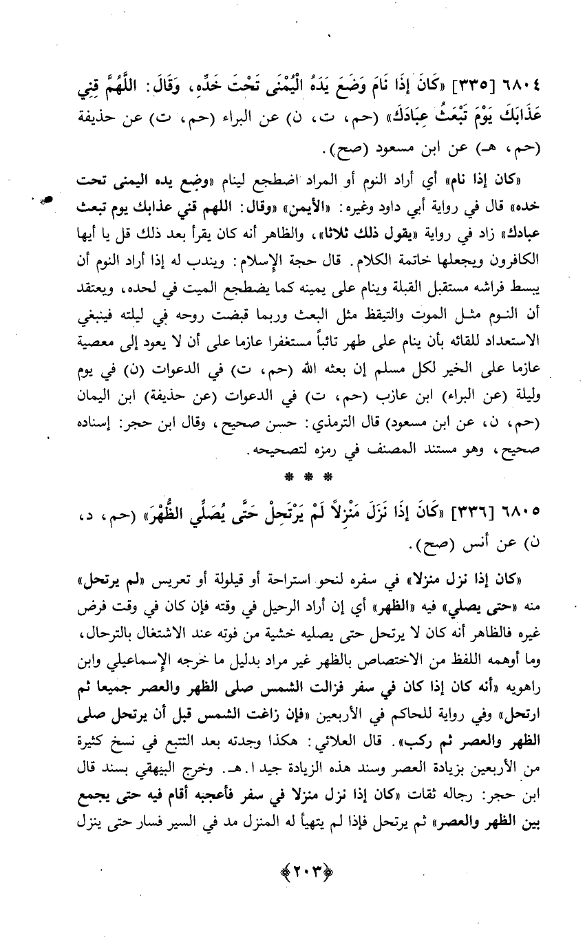 كَانَ إِذا نَام أَي أَرَادَ النّوم أوالمراد اضْطجع لينام وضع يَده الْيُمْنَى تَحت خَدّه قَالَ فِي رِوَايَة أبي دَاوُد وَغَيره الْأَيْمن وَقَالَ اللَّهُمَّ قني عذابك يَوْم تبْعَث عِبَادك زَاد فِي رِوَايَة يَقُول ذَلِك ثَلَاثًا وَالظَّاهِر أَنه كَانَ يقْرَأ بعد ذَلِك قل يَا أَيهَا الْكَافِرُونَ ويجعلها خَاتِمَة الْكَلَام قَالَ حجَّة الْإِسْلَام وَينْدب لَهُ إِذا أَرَادَ النّوم أَن يبسط فرَاشه مُسْتَقْبل الْقبْلَة وينام على يَمِينه كَمَا يضطجع الْمَيِّت فِي لحده ويعتقد أَن النّوم مثل الْمَوْت والتيقظ مثل الْبَعْث وَرُبمَا قبضت روحه فِي ليلته فَيَنْبَغِي الاستعداد للقائه بِأَن ينَام على طهر تَائِبًا مُسْتَغْفِرًا عَازِمًا على أَن لَا يعود إِلَى مَعْصِيّة عَازِمًا على الْخَيْر لكل مُسلم إِن بَعثه الله حم ت فِي الدَّعْوَات ن فِي يَوْم وَلَيْلَة عَن الْبَراء ابْن عَازِب حم ت فِي الدَّعْوَات عَن حُذَيْفَة ابْن الْيَمَان حم ن عَن ابْن مَسْعُود قَالَ التِّرْمِذِيّ // حسن صَحِيح // وَقَالَ ابْن حجر // إِسْنَاده صَحِيح // وَهُوَ مُسْتَند المُصَنّف فِي رمزه لتصحيحه