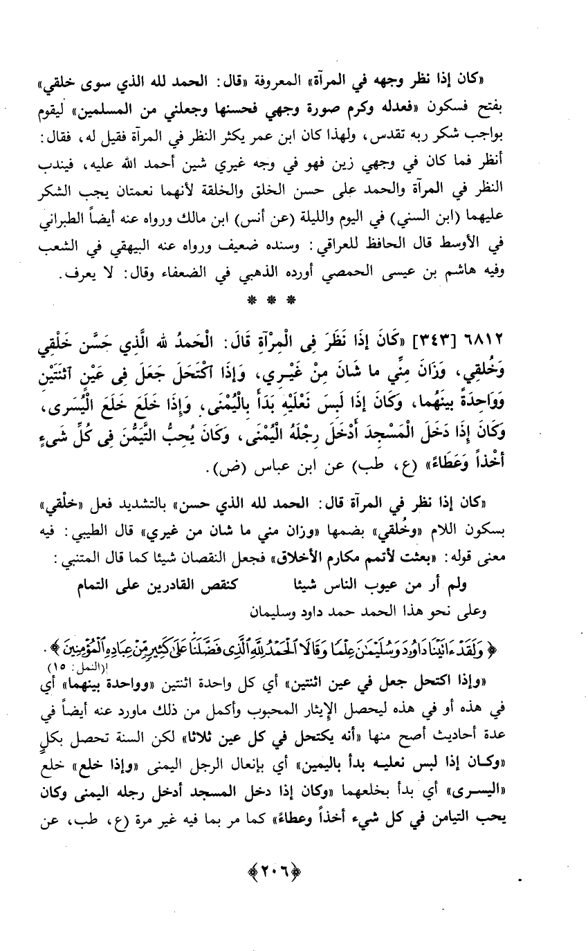 343 - (كَانَ إِذا نظر فِي الْمرْآة قَالَ الْحَمد لله الَّذِي حسن خلقي وَخلقِي وزان مني مَا شان من غَيْرِي وَإِذا اكتحل جعل فِي عين اثْنَتَيْنِ وَوَاحِدَة بَينهمَا وَكَانَ إِذا لبس نَعْلَيْه بَدَأَ باليمنى وَإِذا خلع خلع الْيُسْرَى وَكَانَ إِذا دخل الْمَسْجِد أَدخل رجله الْيُمْنَى وَكَانَ يحب التَّيَمُّن فِي كل شَيْء أخذا وَعَطَاء) ع طب عَن ابْن عَبَّاس ض