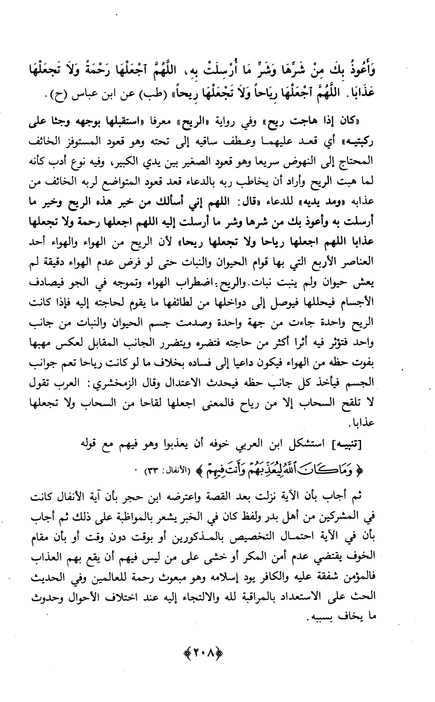 كَانَ إِذا هَاجَتْ ريح وَفِي رِوَايَة الرّيح مُعَرفا اسْتَقْبلهَا بِوَجْهِهِ وَجَثَا على رُكْبَتَيْهِ أَي قعد عَلَيْهِمَا وَعطف سَاقيه إِلَى تَحْتَهُ وَهُوَ قعُود المستوفز الْخَائِف الْمُحْتَاج إِلَى النهوض سَرِيعا وَهُوَ قعُود الصَّغِير بَين يَدي الْكَبِير وَفِيه نوع أدب كَأَنَّهُ لما هبت الرّيح وَأَرَادَ أَن يُخَاطب ربه بِالدُّعَاءِ قعد قعُود المتواضع لرَبه الْخَائِف من عَذَابه وَمد يَدَيْهِ للدُّعَاء قَالَ اللَّهُمَّ إِنِّي أَسأَلك من خير هَذِه الرّيح وَخير مَا أرْسلت بِهِ وَأَعُوذ بك من شَرها وَشر مَا أرْسلت إِلَيْهِ اللَّهُمَّ اجْعَلْهَا رَحْمَة وَلَا تجعلها عذَابا اللَّهُمَّ اجْعَلْهَا رياحا وَلَا تجعلها ريحًا لِأَن الرّيح من الْهَوَاء والهواء أحد العناصر الْأَرْبَع الَّتِي بهَا قوام الْحَيَوَان والنبات حَتَّى لَو فرض عدم الْهَوَاء دقيقة لم يَعش حَيَوَان وَلم ينْبت نَبَات وَالرِّيح اضْطِرَاب الْهَوَاء وتموجه فِي الجو فيصادف الْأَجْسَام فيحللها فيوصل إِلَى دواخلها من لطائفها مَا يقوم لِحَاجَتِهِ إِلَيْهِ فَإِذا كَانَت الرّيح وَاحِدَة جَاءَت من جِهَة وَاحِدَة وصدمت جسم الْحَيَوَان والنبات من جَانب وَاحِد قتؤثر فِيهِ أثرا أَكثر من حَاجته فتضره ويتضرر الْجَانِب االمقابل لعكس مهبها بفوت حَظه من الْهَوَاء فَيكون دَاعيا إِلَى فَسَاده بِخِلَاف مَا لَو كَانَت رياحا تعم جَوَانِب الْجِسْم فَيَأْخُذ كل جَانب حَظه فَيحدث الِاعْتِدَال وَقَالَ الزَّمَخْشَرِيّ الْعَرَب تَقول لَا تلقح السَّحَاب إِلَّا من ريَاح فَالْمَعْنى اجْعَلْهَا لقاحا من السَّحَاب وَلَا تجعلها عذَابا