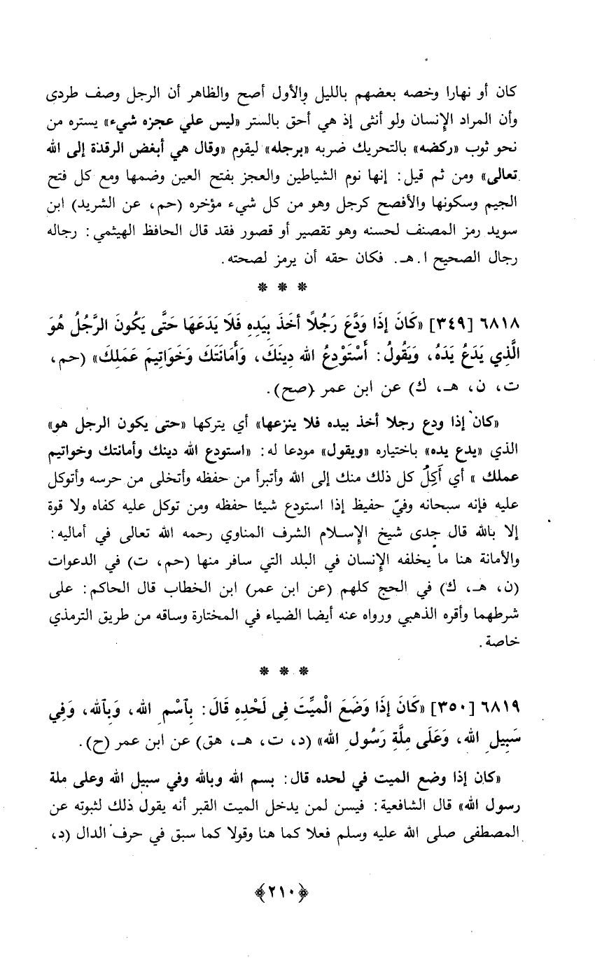 349 - (كَانَ إِذا ودع رجلا أَخذ بِيَدِهِ فَلَا يَدعهَا حَتَّى يكون الرجل هُوَ الَّذِي يدع يَده وَيَقُول أستودع الله دينك وأمانتك وخواتيم عَمَلك) حم ت ن هـ ك عَن ابْن عمر // صَحَّ //