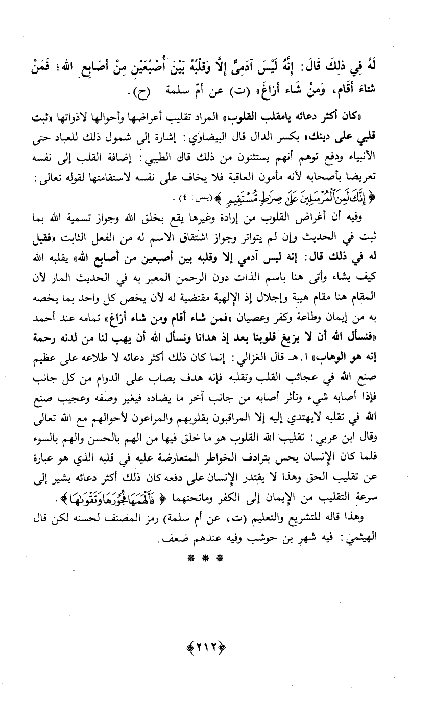 وَفِيه أَن أغراض الْقُلُوب من إِرَادَة وَغَيرهَا يَقع بِخلق الله وَجَوَاز تَسْمِيَة الله بِمَا ثَبت فِي الحَدِيث وَإِن لم يتواتر وَجَوَاز اشتقاق الِاسْم لَهُ من الْفِعْل الثَّابِت فَقيل لَهُ فِي ذَلِك قَالَ إِنَّه لَيْسَ آدَمِيّ إِلَّا وَقَلبه بَين أصبعين من أَصَابِع الله يقلبه الله كَيفَ يَشَاء وأتى هُنَا باسم الذَّات دون الرَّحْمَن الْمعبر بِهِ فِي الحَدِيث الْمَار لِأَن الْمقَام هُنَا مقَام هَيْبَة وإجلال إِذْ الإلهية مقتضية لَهُ لِأَن يخص كل وَاحِد بِمَا يَخُصُّهُ بِهِ من إِيمَان وَطَاعَة وَكفر وعصيان فَمن شَاءَ أَقَامَ وَمن شَاءَ أزاغ تَمَامه عِنْد أَحْمد فنسأل الله أَن لَا يزِيغ قُلُوبنَا بعد إِذْ هدَانَا ونسأل الله أَن يهب لنا من لَدنه رَحْمَة إِنَّه هُوَ الْوَهَّاب اهـ قَالَ الْغَزالِيّ إِنَّمَا كَانَ ذَلِك أَكثر دُعَائِهِ لاطلاعه على عَظِيم صنع الله فِي عجائب الْقلب وتقلبه فَإِنَّهُ هدف يصاب على الدَّوَام من كل جَانب فَإِذا أَصَابَهُ شَيْء وتأثر أَصَابَهُ من جَانب آخر مَا يضاده فيغير وَصفه وَعَجِيب صنع الله فِي تقلبه لَا يَهْتَدِي إِلَيْهِ إِلَّا المراقبون بقلوبهم والمراعون لأحوالهم مَعَ الله تَعَالَى وَقَالَ ابْن عَرَبِيّ تقليب الله الْقُلُوب هُوَ مَا خلق فِيهَا من الْهم بالْحسنِ والهم بالسوء فَلَمَّا كَانَ الْإِنْسَان يحس بترادف الخواطر المتعارضة عَلَيْهِ فِي قلبه الَّذِي هُوَ عبارَة عَن تقليب الْحق وَهَذَا لَا يقتدر الْإِنْسَان على دَفعه كَانَ ذَلِك أَكثر دُعَائِهِ يُشِير إِلَى سرعَة التقليب من الْإِيمَان إِلَى الْكفْر وَمَا تحتهما فألهمها فجورها وتقوها