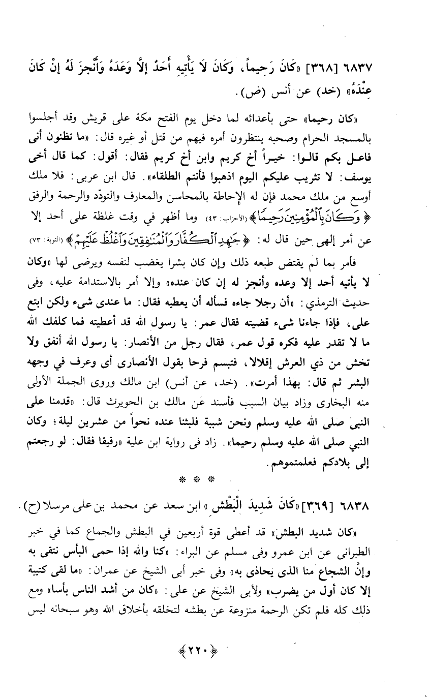 كَانَ شَدِيد الْبَطْش قد أعْطى قُوَّة أَرْبَعِينَ فِي الْبَطْش وَالْجِمَاع كَمَا فِي خبر الطَّبَرَانِيّ عَن ابْن عَمْرو وَفِي مُسلم عَن الْبَراء كُنَّا وَالله إِذا حمي الْبَأْس نتقي بِهِ وَإِن الشجاع منا الَّذِي يُحَاذِي بِهِ وَفِي خبر أبي الشَّيْخ عَن عمرَان مَا لَقِي كَتِيبَة إِلَّا كَانَ أول من يضْرب وَلأبي الشَّيْخ عَن عَليّ كَانَ من أَشد النَّاس بَأْسا وَمَعَ ذَلِك كُله فَلم تكن الرَّحْمَة منزوعة عَن بطشه لتخلقه بأخلاق الله وَهُوَ سُبْحَانَهُ لَيْسَ