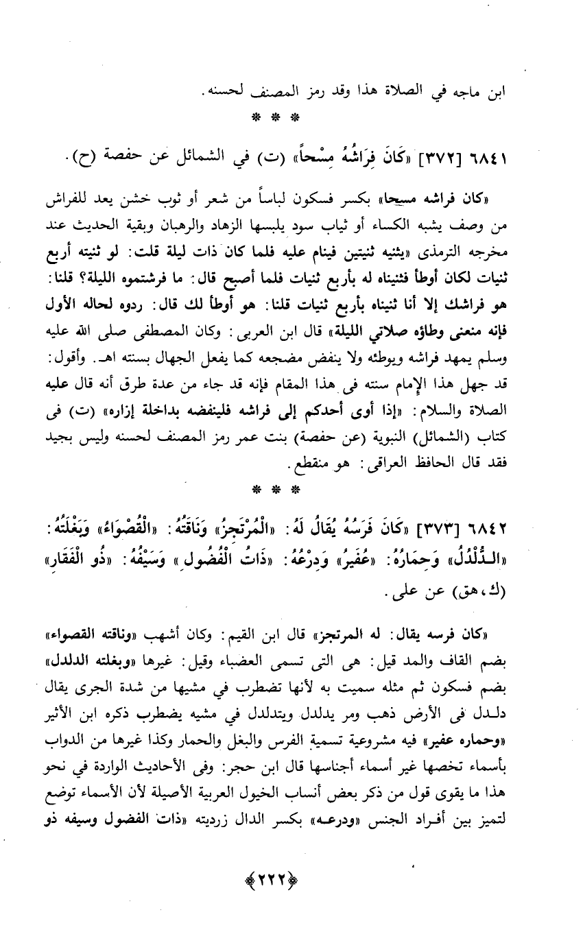 373 - (كَانَ فرسه يُقَال لَهُ المرتجز وناقته الْقَصْوَاء وَبغلته الدلْدل وَحِمَاره عفير وَدِرْعه ذَات الفضول وسيفه ذُو الفقار ك هق عَن عَليّ