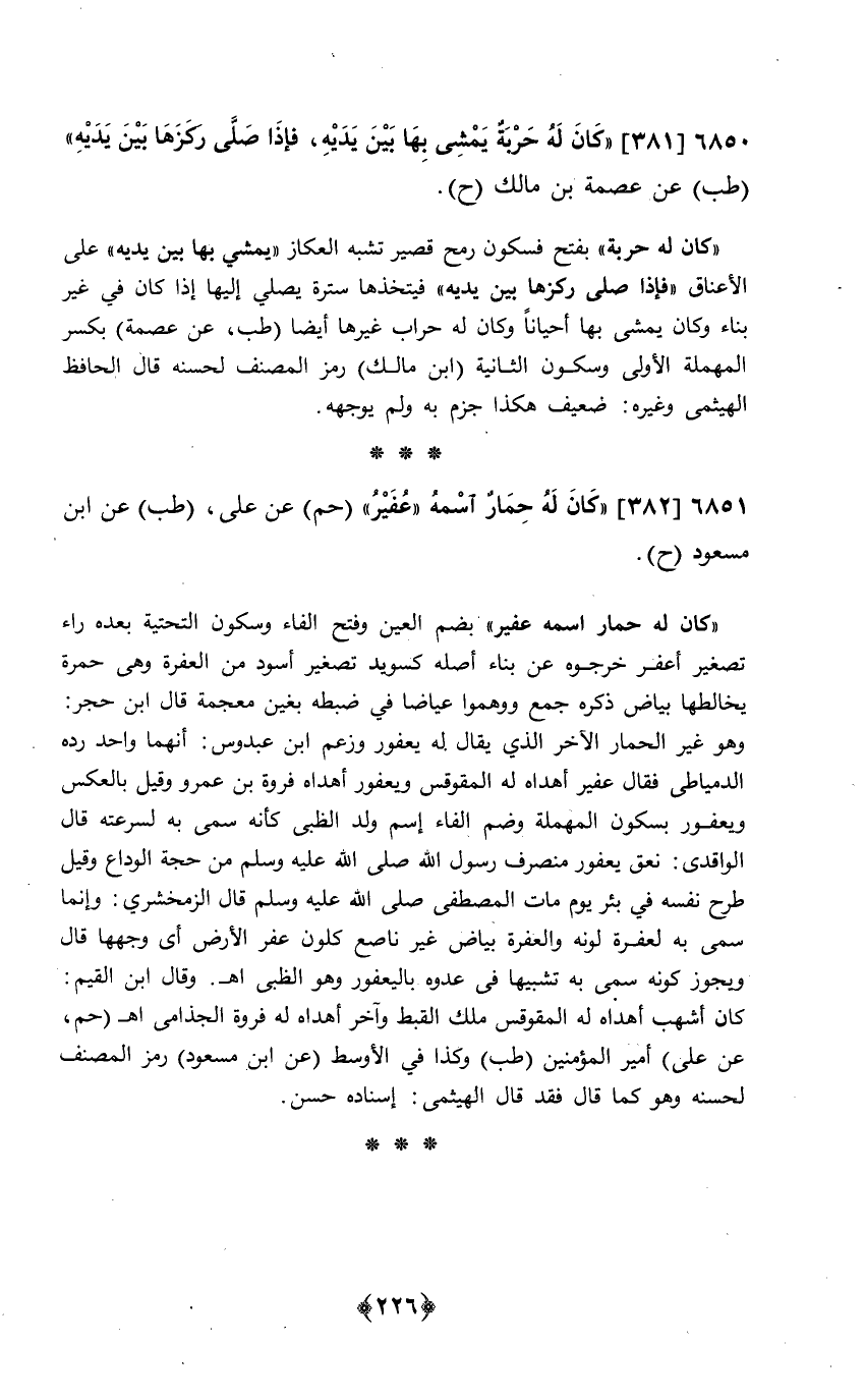 38 - (كَانَ لَهُ حمَار اسْمه عفير) حم عَن عَليّ طب عَن ابْن مَسْعُود ح