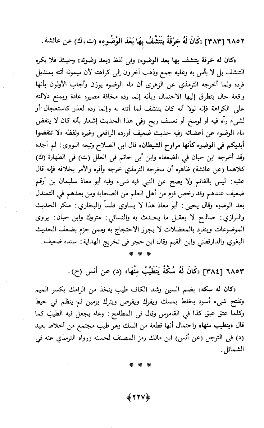 383 - (كَانَ لَهُ خرقَة يتنشف بهَا بعد الْوضُوء) ت ك عَن عَائِشَة