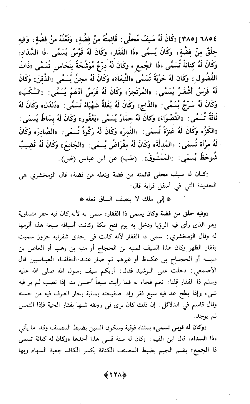 وَفِيه حلق من فضَّة وَكَانَ يُسمى ذَا الفقار سمي بِهِ لِأَنَّهُ كَانَ فِيهِ حفر مُتَسَاوِيَة وَهُوَ الَّذِي رأى فِيهِ الرُّؤْيَا وَدخل بِهِ يَوْم فتح مَكَّة وَكَانَت أسيافه سَبْعَة هَذَا ألزمها لَهُ وَقَالَ الزَّمَخْشَرِيّ سمي ذَا الفقار لِأَنَّهُ كَانَت فِي إِحْدَى شفرتيه حزوز سميت بفقار الظّهْر وَكَانَ هَذَا السَّيْف لمنبه بن الْحجَّاج أَو مُنَبّه بن وهب أَو الْعَاصِ بن مُنَبّه أَو الْحجَّاج بن عكاظ أَو غَيرهم ثمَّ صَار عِنْد الْخُلَفَاء العباسيين قَالَ الْأَصْمَعِي دخلت على الرشيد فَقَالَ أريكم سيف رَسُول الله صلى الله عَلَيْهِ وَسلم ذَا الفقار قُلْنَا نعم فجَاء بِهِ فَمَا رَأَيْت سَيْفا أحسن مِنْهُ إِذا نصب لم ير فِيهِ شَيْء وَإِذا بطح عد فِيهِ سبع فقر وَإِذا صفيحته يَمَانِية يحار الطّرف فِيهِ من حسنه وَقَالَ قَاسم فِي الدَّلَائِل إِن ذَلِك كَانَ يرى فِي رونقه شبها بفقار الْحَيَّة فَإِذا التمس لم يُوجد