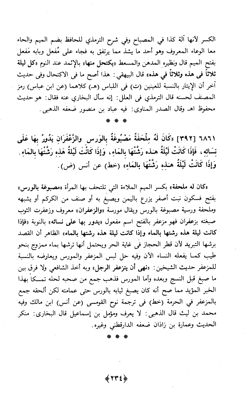 كَانَ لَهُ ملحفة بِكَسْر الْمِيم الملاءة الَّتِي تلتحف بهَا الْمَرْأَة مصبوغة بالورس بِفَتْح فَسُكُون نبت أصفر يزرع بِالْيمن ويصبغ بِهِ أَو صنف من الكركم أَو يُشبههُ وَمِلْحَفَة ورسية مصبوغة بالورس وَيُقَال مورسة والزعفران مَعْرُوف وزعفرت الثَّوْب صبغته بزعفران فَهُوَ مزعفر بِالْفَتْح اسْم مفعول يَدُور بهَا على نِسَائِهِ بالنوبة فَإِذا كَانَت لَيْلَة هَذِه رشتها بِالْمَاءِ وَإِذا كَانَت لَيْلَة هَذِه رشتها بِالْمَاءِ الظَّاهِر أَن الْقَصْد برشها التبريد لِأَن قطر الْحجاز فِي غَايَة الْحر وَيحْتَمل أَنَّهَا ترشها بِمَاء ممزوج بِنَحْوِ طيب كَمَا يَفْعَله النِّسَاء الْآن وَفِيه حل لبس المزعفر والمورس ويعارضه بِالنِّسْبَةِ للمزعفر حَدِيث الشَّيْخَيْنِ نهى أَن يتزعفر الرجل وَبِه أَخذ الشَّافِعِي وَلَا فرق بَين مَا صبغ قبل النسج وَبعده وَأما المورس فَذهب جمع من صَحبه لِحلِّهِ تمسكا بِهَذَا الْخَبَر الْمُؤَيد مِمَّا صَحَّ أَنه كَانَ يصْبغ ثِيَابه بالورس حَتَّى عمَامَته لَكِن ألحقهُ جمع بالمزعفر فِي الْحُرْمَة خطّ فِي تَرْجَمَة نوح القومسي عَن أنس ابْن مَالك وَفِيه مُحَمَّد بن لَيْث قَالَ الذَّهَبِيّ لَا يعرف ومؤمل بن إِسْمَاعِيل قَالَ البُخَارِيّ مُنكر الحَدِيث وَعمارَة بن زَاذَان ضعفه الدَّارَقُطْنِيّ وَغَيره
