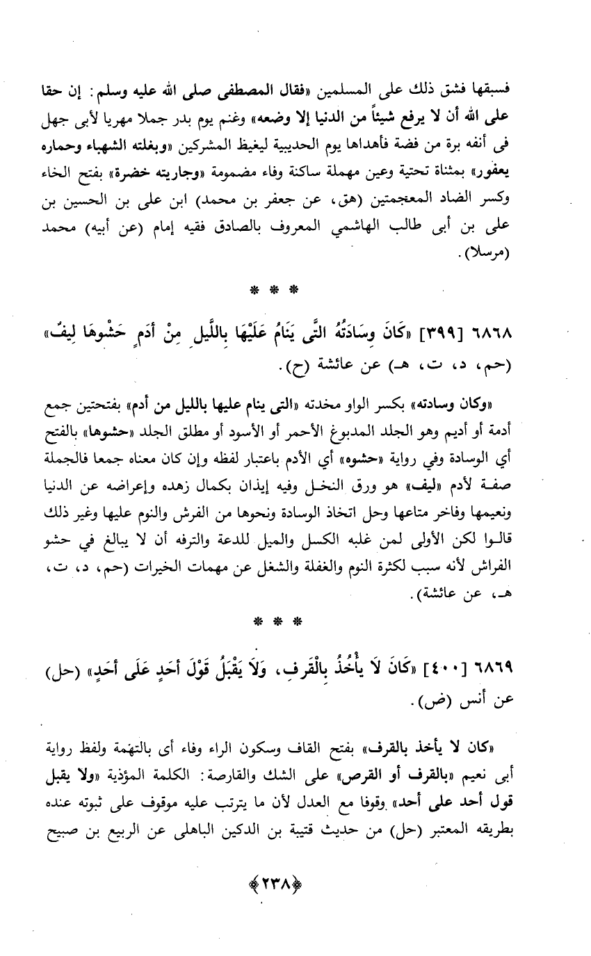 399 - (كَانَ وسادته الَّتِي ينَام عَلَيْهَا بِاللَّيْلِ من أَدَم حشوها لِيف) حم د ت هـ عَن عَائِشَة ح