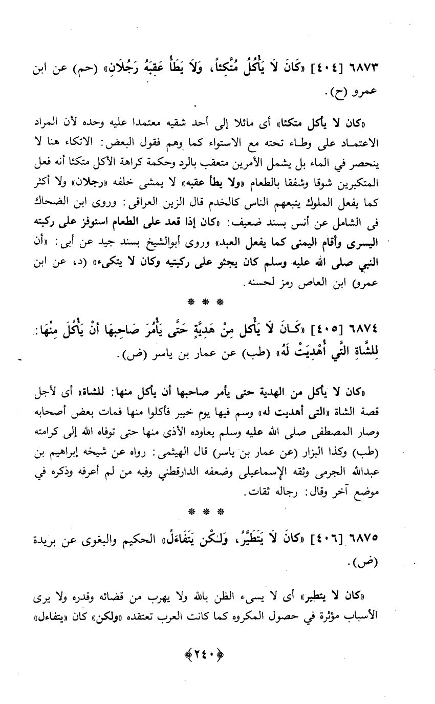 404 - (كَانَ لَا يَأْكُل مُتكئا وَلَا يطَأ عقبَة رجلَانِ) حم عَن ابْن عَمْرو ح