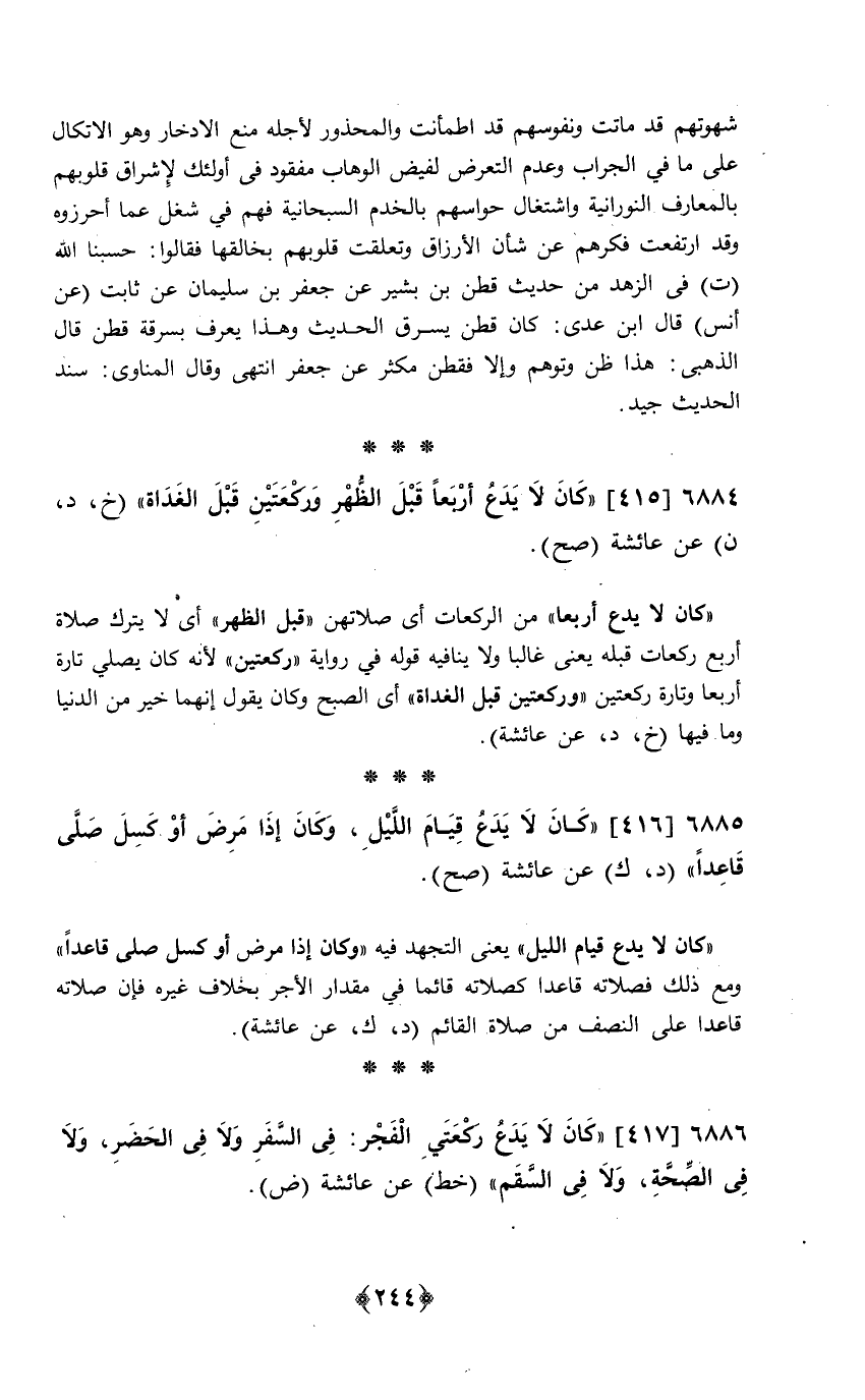 417 - (كَانَ لَا يدع رَكْعَتي الْفجْر فِي السّفر وَلَا فِي الْحَضَر وَلَا فِي الصِّحَّة وَلَا فِي السقم) خطّ عَن عَائِشَة ض