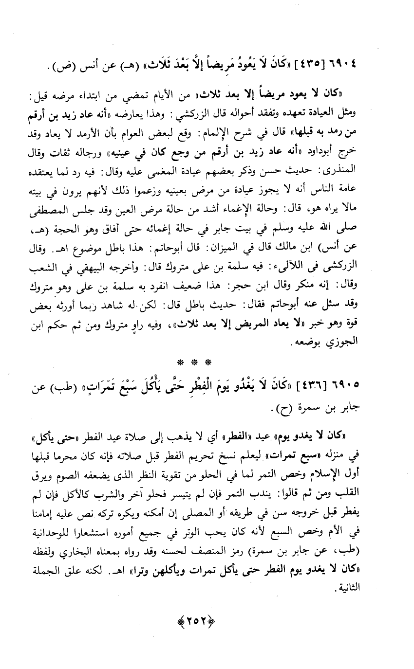 كَانَ لَا يعود مَرِيضا إِلَّا بعد ثَلَاث من الْأَيَّام تمْضِي من ابْتِدَاء مَرضه قيل وَمثل العيادة تعهده وتفقد أَحْوَاله قَالَ الزَّرْكَشِيّ وَهَذَا يُعَارضهُ أَنه عَاد زيد بن أَرقم من رمد بِهِ قبلهَا قَالَ فِي شرح الْإِلْمَام وَقع لبَعض الْعَوام بِأَن الأرمد لَا يعد وَقد خرج أَبُو دَاوُد أَنه عَاد زيد بن أَرقم من وجع كَانَ فِي عَيْنَيْهِ وَرِجَاله ثِقَات وَقَالَ الْمُنْذِرِيّ // حَدِيث حسن // وَذكر بَعضهم عِيَادَة الْمغمى عَلَيْهِ وَقَالَ فِيهِ رد لما يَعْتَقِدهُ عَامَّة النَّاس أَنه لَا يجوز عِيَادَة من مرض بِعَيْنيهِ وَزَعَمُوا ذَلِك لأَنهم يرَوْنَ فِي بَيته مَالا يرَاهُ هُوَ قَالَ وَحَالَة الْإِغْمَاء أَشد من حَالَة مرض الْعين وَقد جلس الْمُصْطَفى صلى الله عَلَيْهِ وَسلم فِي بَيت جَابر فِي حَالَة إغمائه حَتَّى أَفَاق وَهُوَ الْحجَّة هـ عَن أنس ابْن مَالك قَالَ فِي الْمِيزَان قَالَ أَبُو حَاتِم هَذَا بَاطِل مَوْضُوع اه وَقَالَ الزَّرْكَشِيّ فِي اللآليء فِيهِ سَلمَة بن عَليّ مَتْرُوك قَالَ وَأخرجه الْبَيْهَقِيّ فِي الشّعب وَقَالَ إِنَّه مُنكر وَقَالَ ابْن حجر هَذَا ضَعِيف انْفَرد بِهِ سَلمَة بن عَليّ وَهُوَ مَتْرُوك وَقد سُئِلَ عَنهُ أَبُو حَاتِم فَقَالَ حَدِيث بَاطِل قَالَ لَكِن لَهُ شَاهد رُبمَا أورثه بعض قُوَّة وَهُوَ خبر لَا يُعَاد الْمَرِيض إِلَّا بعد ثَلَاث وَفِيه راو مَتْرُوك وَمن ثمَّ حكم ابْن الْجَوْزِيّ بِوَضْعِهِ