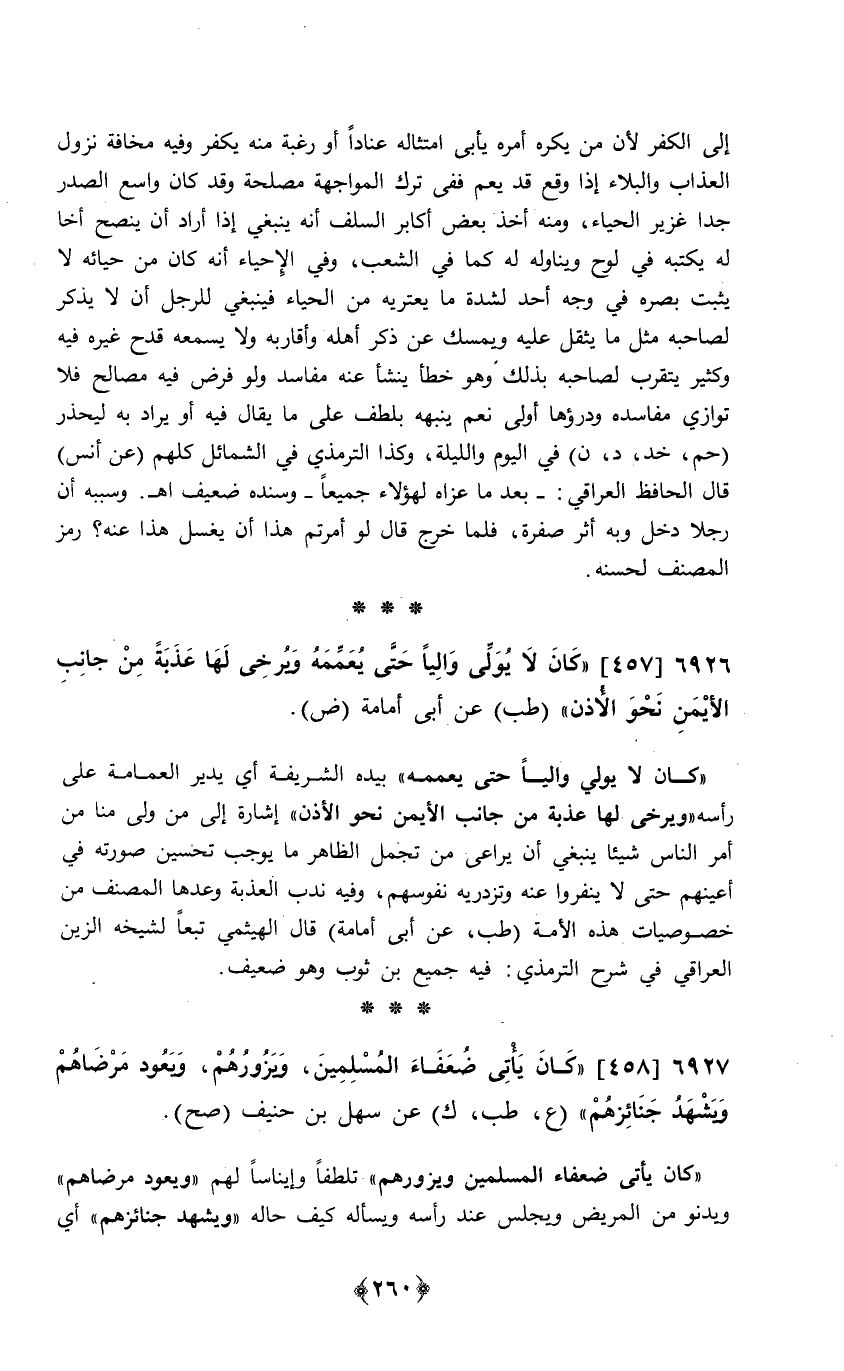 إِلَى الْكفْر لِأَن من يكره يَأْبَى امتثاله عنادا أَو رَغْبَة مِنْهُ يكفر وَفِيه مَخَافَة نزُول الْعَذَاب وَالْبَلَاء إِذا وَقع قد يعم فَفِي ترك المواجهة مصلحَة وَقد كَانَ وَاسع الصَّدْر جدا غزير الْحيَاء وَمِنْه أَخذ بعض أكَابِر السّلف أَنه يَنْبَغِي إِذا أَرَادَ أَن ينصح أَخا لَهُ يَكْتُبهُ فِي لوح ويناوله لَهُ كَمَا فِي الشّعب وَفِي الْإِحْيَاء فَيَنْبَغِي للرجل أَن لَا يذكر لصَاحبه مثل مَا يثقل عَلَيْهِ ويمسك عَن ذكر أَهله وأقاربه وَلَا يسمعهُ قدح غَيره فِيهِ وَكثير يتَقرَّب لصَاحبه بذلك وَهُوَ خطأ ينشأ عَنهُ مفاسد وَلَو فرض فِيهِ مصَالح فَلَا توازي مفاسده ودرؤها أولى نعم ينبهه بلطف على مَا يُقَال فِيهِ أَو يُرَاد بِهِ ليحذر حم خد د ن فِي الْيَوْم وَاللَّيْلَة وَكَذَا التِّرْمِذِيّ فِي الشَّمَائِل كلهم عَن أنس قَالَ الْحَافِظ الْعِرَاقِيّ بعد مَا عزاهُ لهَؤُلَاء جَمِيعًا // وَسَنَده ضَعِيف // اه وَسَببه أَن رجلا دخل وَبِه أثر صفرَة فَلَمَّا خرج قَالَ لَو أمرْتُم هَذَا أَن يغسل هَذَا عَنهُ رمز المُصَنّف لحسنه