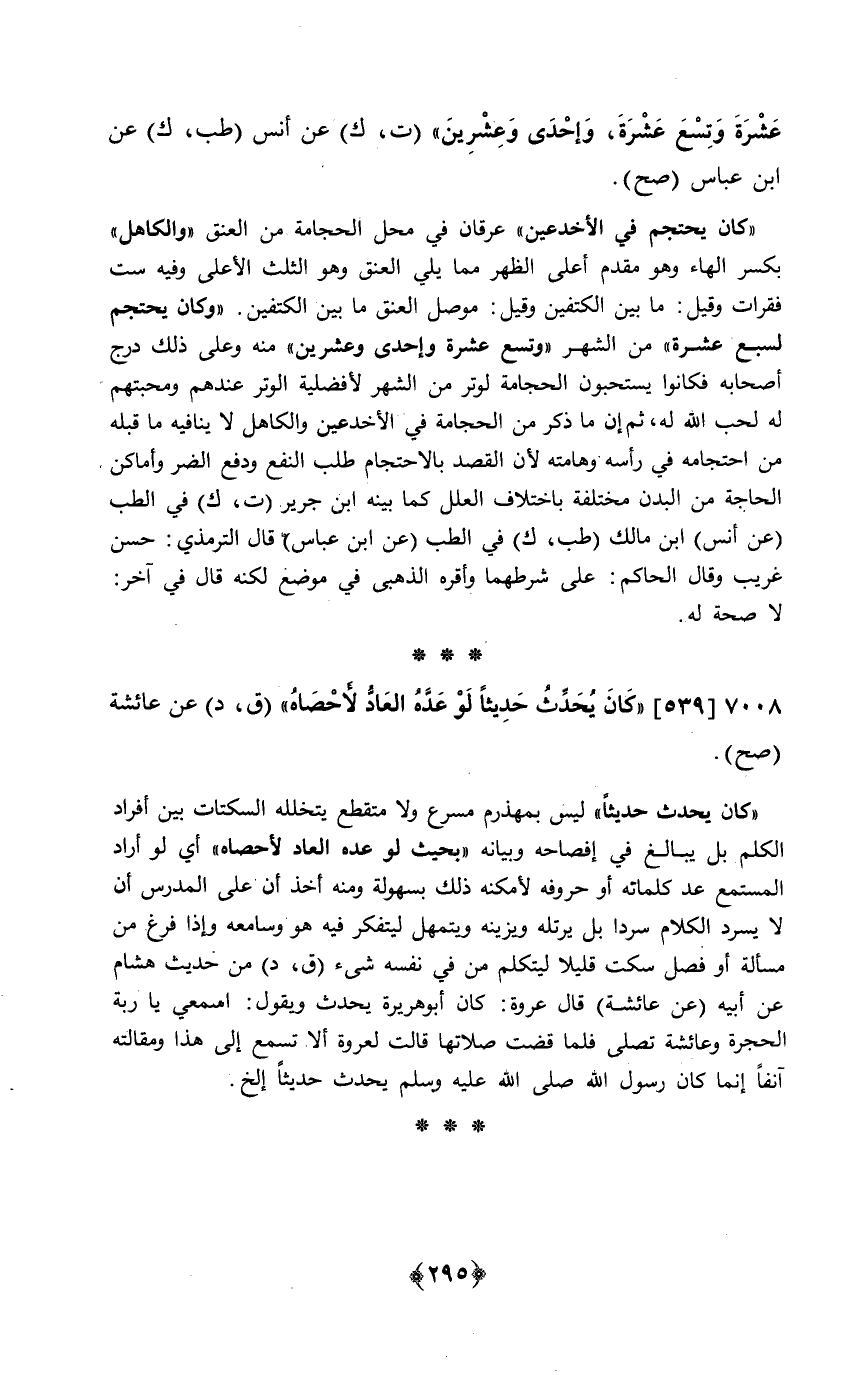 كَانَ يحتجم فِي الأخدعين عرقان فِي مَحل الْحجامَة من الْعُنُق والكاهل بِكَسْر الْهَاء وَهُوَ مقدم أَعلَى الظّهْر مِمَّا يَلِي الْعُنُق وَهُوَ الثُّلُث الْأَعْلَى وَفِيه سِتّ فقرات وَقيل مَا بَين الْكَتِفَيْنِ وَقيل موصل الْعُنُق مَا بَين الْكَتِفَيْنِ وَكَانَ يحتجم لسبع عشرَة من الشَّهْر وتسع عشرَة وَإِحْدَى وَعشْرين مِنْهُ وعَلى ذَلِك درج أَصْحَابه فَكَانُوا يستحبون الْحجامَة لوتر من الشَّهْر لأفضلية الْوتر عِنْدهم ومحبتهم لَهُ لحب الله لَهُ ثمَّ إِن مَا ذكر من الْحجامَة فِي الاخدعين والكاهل لَا يُنَافِيهِ مَا قبله من احتجامه فِي رَأسه وهامته لِأَن الْقَصْد بالاحتجام طلب النَّفْع وَدفع الضّر وأماكن الْحَاجة من الْبدن مُخْتَلفَة باخْتلَاف الْعِلَل كَمَا بَينه ابْن جرير ت ك فِي الطِّبّ عَن أنس ابْن مَالك طب ك فِي الطِّبّ عَن ابْن عَبَّاس قَالَ التِّرْمِذِيّ // حسن غَرِيب // وَقَالَ الْحَاكِم على شَرطهمَا وَأقرهُ الذَّهَبِيّ فِي وضع لكنه قَالَ فِي آخر لَا صِحَة لَهُ