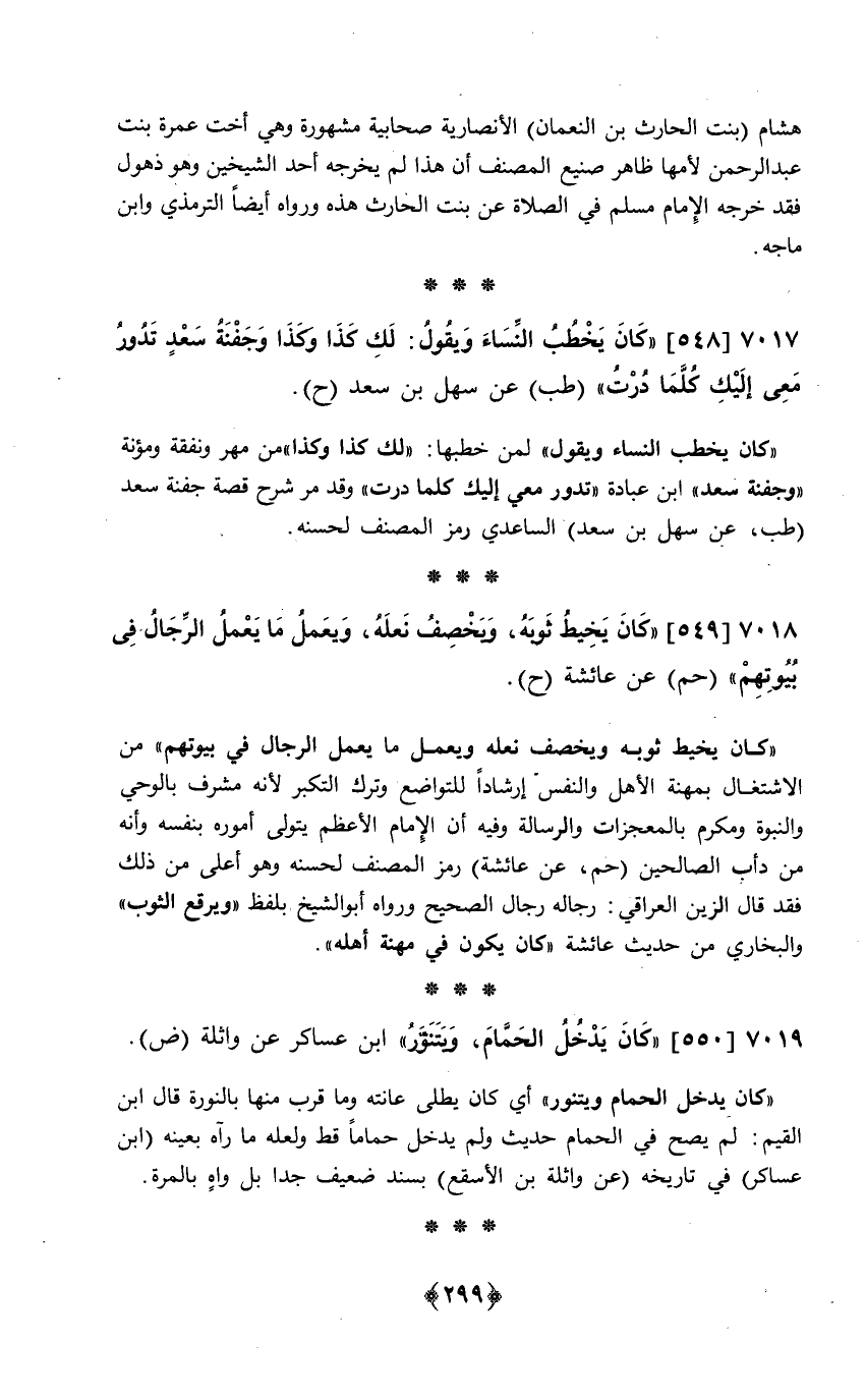 كَانَ يدْخل الْحمام ويتنور أَي كَانَ يطلي عانته وَمَا قرب مِنْهَا بالنورة قَالَ ابْن الْقيم لم يَصح فِي الْحمام حَدِيث وَلم يدْخل حَماما قطّ وَلَعَلَّه مَا رَآهُ بِعَيْنِه ابْن عَسَاكِر فِي تَارِيخه عَن وَاثِلَة بن الْأَسْقَع // بِسَنَد ضَعِيف جدا // بل واه بالمرة