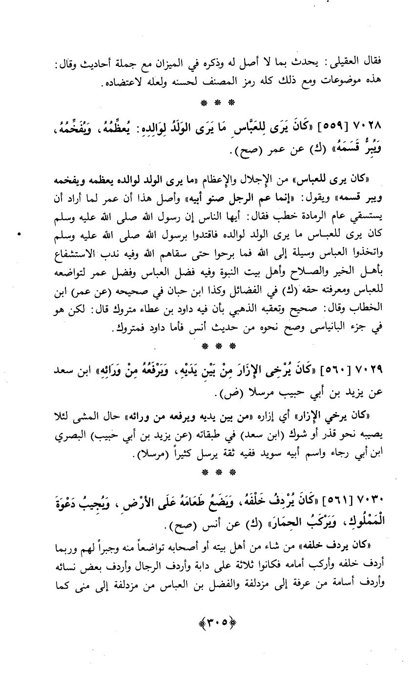 كَانَ يرى للْعَبَّاس من الإجلال والإعظام مَا يرى الْوَلَد لوالده يعظمه ويفخمه ويبر قسمه وَيَقُول إِنَّمَا عَم الرجل صنو أَبِيه وأصل هَذَا أَن عمر لما أَرَادَ أَن يَسْتَسْقِي عَام الرَّمَادَة خطب فَقَالَ أَيهَا النَّاس إِن رَسُول الله صلى الله عَلَيْهِ وَسلم كَانَ يرى للْعَبَّاس مَا يرى الْوَلَد لوالده فاقتدوا برَسُول الله صلى الله عَلَيْهِ وَسلم وَاتَّخذُوا الْعَبَّاس وَسِيلَة إِلَى الله فَمَا برحوا حَتَّى سقاهم الله وَفِيه ندب الاستشفاع بِأَهْل الْخَيْر وَالصَّلَاح وَأهل بَيت النُّبُوَّة وَفِيه فضل الْعَبَّاس وَفضل عمر لتواضعه للْعَبَّاس ومعرفته حَقه ك فِي الْفَضَائِل وَكَذَا ابْن حبَان فِي صَحِيحه عَن عمر ابْن الْخطاب وَقَالَ صَحِيح وَتعقبه الذَّهَبِيّ بِأَن فِيهِ دَاوُد بن عَطاء مَتْرُوك قَالَ لَكِن هُوَ فِي جُزْء البانياسي وَصَحَّ نَحوه من حَدِيث أنس فَأَما دَاوُد فمتروك