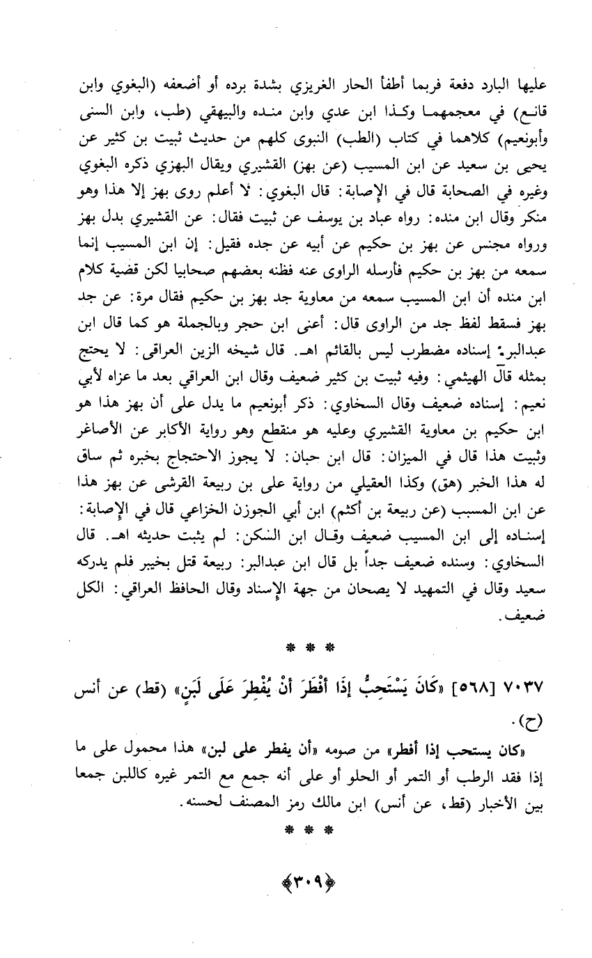 عَلَيْهَا الْبَارِد دفْعَة فَرُبمَا أطفأ الْحَار الغريزي بِشدَّة برده أَو أضعفه الْبَغَوِيّ وَابْن قَانِع فِي معجمهما وَكَذَا ابْن عدي وَابْن مَنْدَه وَالْبَيْهَقِيّ طب وَابْن السّني وَأَبُو نعيم كِلَاهُمَا فِي = كتاب الطِّبّ النَّبَوِيّ = كلهم من حَدِيث ثبيت بن كثير عَن يحيى بن سعيد عَن ابْن الْمسيب عَن بهز الْقشيرِي وَيُقَال الْبَهْزِي ذكره الْبَغَوِيّ وَغَيره فِي الصَّحَابَة قَالَ فِي الْإِصَابَة قَالَ الْبَغَوِيّ لَا أعلم روى بهز إِلَّا هَذَا وَهُوَ مُنكر وَقَالَ ابْن مَنْدَه رَوَاهُ عباد بن يُوسُف عَن ثبيت فَقَالَ عَن الْقشيرِي بدل بهز وَرَوَاهُ مجنس عَن بهز بن حَكِيم عَن أَبِيه عَن جده فَقيل إِن ابْن الْمسيب إِنَّمَا سَمعه من بهز بن حَكِيم فَأرْسلهُ الرَّاوِي عَنهُ فَظَنهُ بَعضهم صحابيا لَكِن قَضِيَّة كَلَام ابْن مَنْدَه أَن ابْن الْمسيب سَمعه من مُعَاوِيَة جد بهز بن حَكِيم فَقَالَ مرّة عَن جد بهز فَسقط لفظ جد من الرَّاوِي قَالَ أَعنِي ابْن حجر وَبِالْجُمْلَةِ هُوَ كَمَا قَالَ ابْن عبد الْبر // إِسْنَاده مُضْطَرب // لَيْسَ بالقائم اه قَالَ شَيْخه الزين الْعِرَاقِيّ لَا يحْتَج بِمثلِهِ قَالَ الهيثمي وَفِيه ثبيت بن كثير ضَعِيف وَقَالَ ابْن الْعِرَاقِيّ بعد مَا عزاهُ لأبي نعيم // إِسْنَاده ضَعِيف // وَقَالَ السخاوي ذكر أَبُو نعيم مَا يدل على أَن بهز هَذَا هُوَ ابْن حَكِيم بن مُعَاوِيَة الْقشيرِي وَعَلِيهِ هُوَ مُنْقَطع وَهُوَ رِوَايَة الأكابر عَن الأصاغر وثبيت هَذَا قَالَ فِي الْمِيزَان قَالَ ابْن حبَان لَا يجوز الِاحْتِجَاج بِخَبَرِهِ ثمَّ سَاق لَهُ هَذَا الْخَبَر هق وَكَذَا الْعقيلِيّ من رِوَايَة عَليّ بن ربيعَة الْقرشِي عَن بهز هَذَا عَن ابْن الْمسيب عَن ربيعَة بن أَكْثَم ابْن أبي الجوزن الْخُزَاعِيّ قَالَ فِي الْإِصَابَة إِسْنَاده إِلَى ابْن الْمسيب ضَعِيف وَقَالَ ابْن السكن لم يثبت حَدِيثه اه قَالَ السخاوي // وَسَنَده ضَعِيف جدا // بل قَالَ ابْن عبد الْبر ربيعَة قتل بِخَيْبَر فَلم يُدْرِكهُ سعيد وَقَالَ فِي التَّمْهِيد لَا يصحان من جِهَة الْإِسْنَاد وَقَالَ الْحَافِظ الْعِرَاقِيّ الْكل ضَعِيف