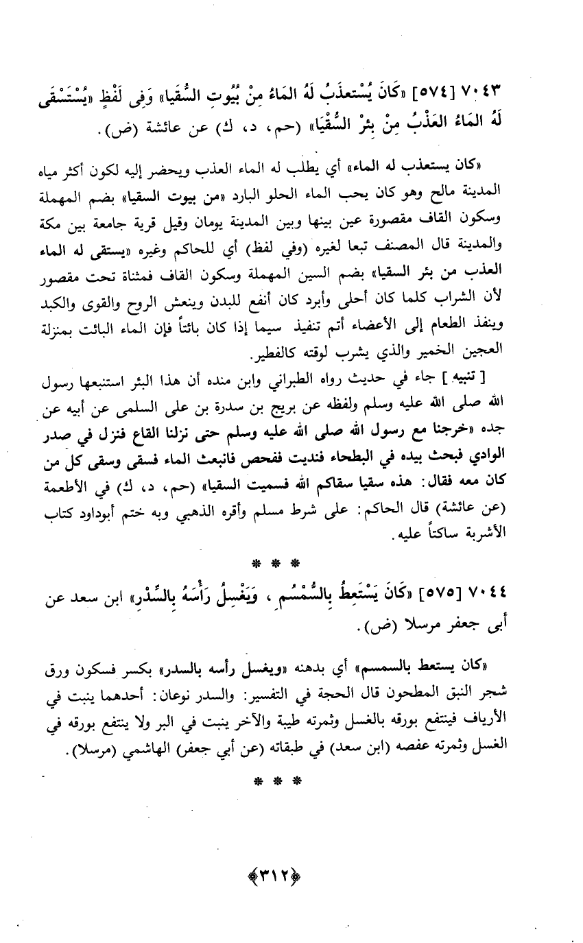 كَانَ يستعط بالسمسم أَي بدهنه وَيغسل رَأسه بالسدر بِكَسْر فَسُكُون ورق شجر النبق المطحون قَالَ الْحجَّة فِي التَّفْسِير والسدر نَوْعَانِ أَحدهمَا ينْبت فِي الأرياف فينتفع بورقه بِالْغسْلِ وثمرته طيبَة وَالْآخر ينْبت فِي الْبر وَلَا ينْتَفع بورقه فِي الْغسْل وثمرته عفصه ابْن سعد فِي طبقاته عَن أبي جَعْفَر الْهَاشِمِي مُرْسلا