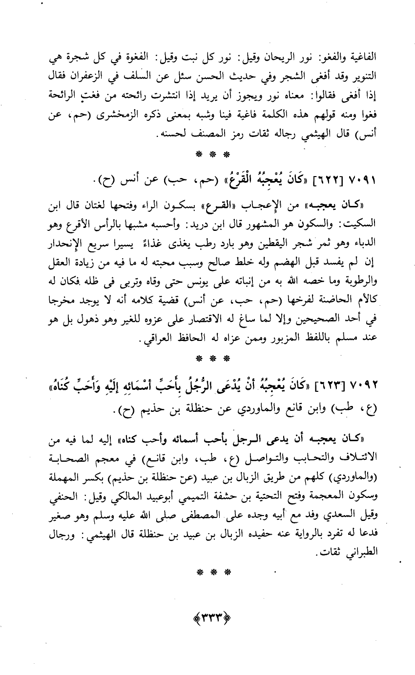كَانَ يُعجبهُ أَن يدعى الرجل بِأحب أَسْمَائِهِ وَأحب كناه إِلَيْهِ لما فِيهِ من الائتلاف والتحابب والتواصل ع طب وَابْن قَانِع فِي مُعْجم الصَّحَابَة وَالْمَاوَرْدِيّ كلهم من طَرِيق الزبال بن عبيد عَن حَنْظَلَة بن حذيم بِكَسْر الْمُهْملَة وَسُكُون الْمُعْجَمَة وَفتح التَّحْتِيَّة بن حَشَفَة التَّمِيمِي أَبُو عبيد الْمَالِكِي وَقيل الْحَنَفِيّ وَقيل السَّعْدِيّ وَفد مَعَ أَبِيه وجده على الْمُصْطَفى صلى الله عَلَيْهِ وَسلم وَهُوَ صَغِير فَدَعَا لَهُ تفرد بالرواية عَنهُ حفيده الزبال بن عبيد بن حَنْظَلَة قَالَ الهيثمي وَرِجَال الطَّبَرَانِيّ ثِقَات