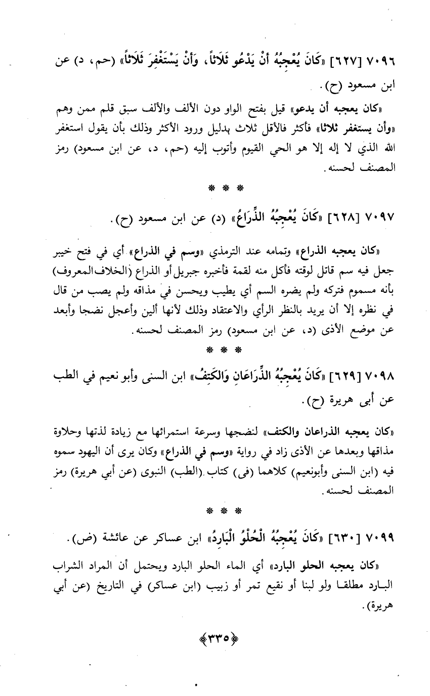 كَانَ يُعجبهُ الذراعان والكتف لنضجها وَسُرْعَة استمرائها مَعَ زِيَادَة لذتها وحلاوة مذاقها وَبعدهَا عَن الْأَذَى زَاد فِي رِوَايَة وسم فِي الذِّرَاع وَكَانَ يرى أَن الْيَهُود سموهُ فِيهِ ابْن السّني وَأَبُو نعيم كِلَاهُمَا فِي = كتاب الطِّبّ النَّبَوِيّ = عَن أبي هُرَيْرَة رمز المُصَنّف لحسنه