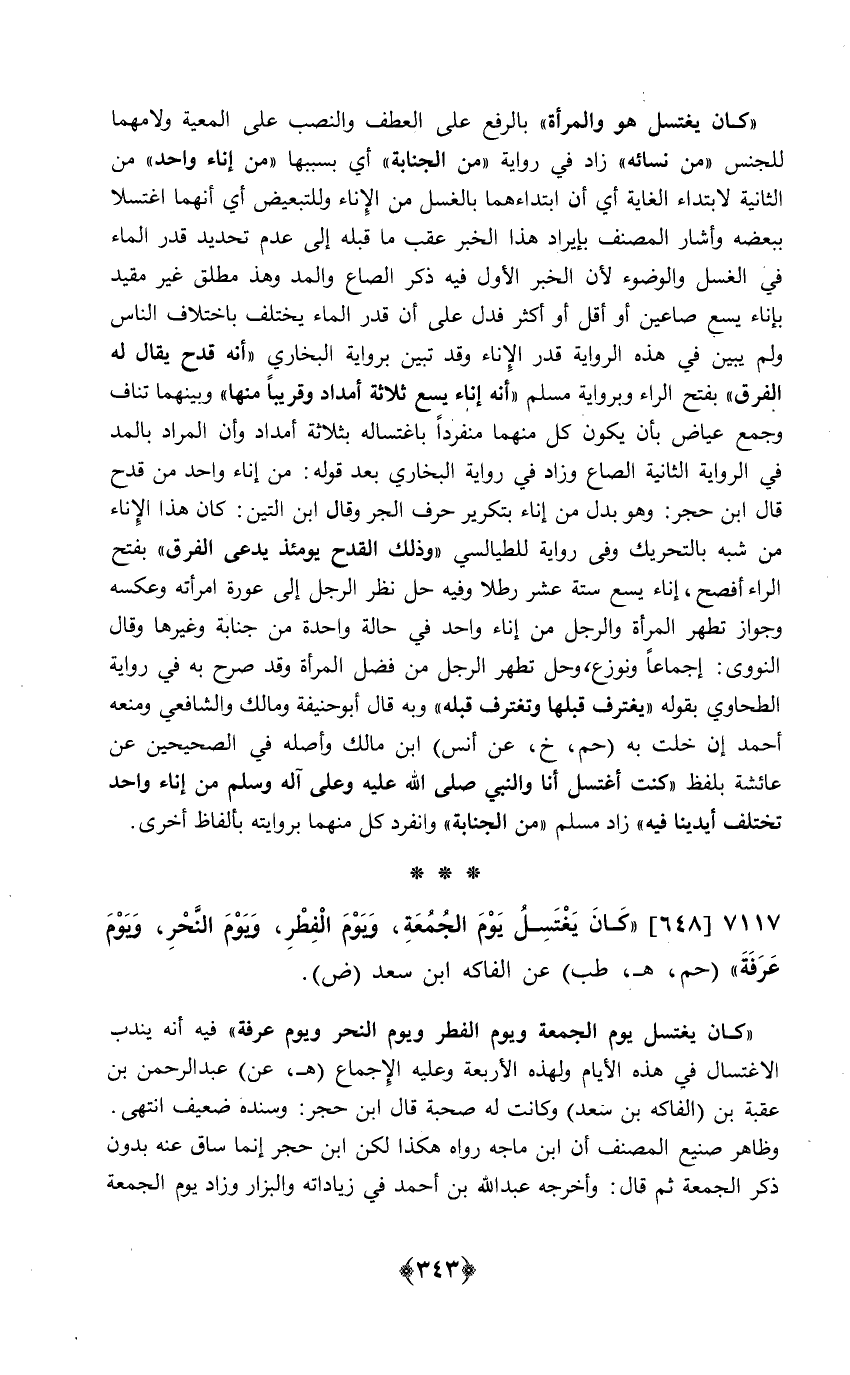 كَانَ يغْتَسل هُوَ وَالْمَرْأَة بالفع على الْعَطف وَالنّصب على الْمَعِيَّة ولامهما للْجِنْس من نِسَائِهِ زَاد فِي رِوَايَة من الْجَنَابَة أَي بِسَبَبِهَا من إِنَاء وَاحِد من الثَّانِيَة لابتداء الْغَايَة أَي ابتداءهما بِالْغسْلِ من الْإِنَاء وللتبعيض أَي أَنَّهُمَا اغتسلا بِبَعْضِه وَأَشَارَ المُصَنّف بإيراد هَذَا الْخَبَر عقب مَا قبله إِلَى عدم تَحْدِيد قدر المَاء فِي الْغسْل وَالْوُضُوء لِأَن الْخَبَر الأول فِيهِ ذكر الصَّاع وَالْمدّ وهذ مُطلق غير مُقَيّد بِإِنَاء يسع صَاعَيْنِ أَو أقل أَو أَكثر فَدلَّ على أَن قدر المَاء يخْتَلف باخْتلَاف النَّاس وَلم يبين فِي هَذِه الرِّوَايَة قدر الْإِنَاء وَقد تبين بِرِوَايَة البُخَارِيّ أَنه قدح يُقَال لَهُ الْفرق بِفَتْح الرَّاء وبرواية مُسلم أَنه إِنَاء يسع ثَلَاثَة أَمْدَاد وقريبا مِنْهَا وَبَينهمَا تناف وَجمع عِيَاض بِأَن يكون كل مِنْهُمَا مُنْفَردا باغتساله بِثَلَاثَة أَمْدَاد وَأَن المُرَاد بِالْمدِّ فِي الرِّوَايَة الثَّانِيَة الصَّاع وَزَاد فِي رِوَايَة البُخَارِيّ بعد قَوْله من إِنَاء وَاحِد من قدح قَالَ ابْن حجر وَهُوَ بدل من إِنَاء بتكرير حرف الْجَرّ وَقَالَ ابْن التِّين كَانَ هَذَا الْإِنَاء من شبه بِالتَّحْرِيكِ وَفِي رِوَايَة للطيالسي وَذَلِكَ الْقدح يَوْمئِذٍ يدعى الْفرق بِفَتْح الرَّاء أفْصح إِنَاء يسع سِتَّة عشر رطلا وَفِيه حل نظر الرجل عَورَة امْرَأَته وَعَكسه وَجَوَاز تطهر الْمَرْأَة وَالرجل من إِنَاء وَاحِد فِي حَالَة وَاحِدَة من جَنَابَة وَغَيرهَا وَقَالَ النووى إِجْمَاعًا ونوزع وَحل تطهر الرجل من فضل الْمَرْأَة وَقد صرح بِهِ فِي رِوَايَة الطَّحَاوِيّ بقوله يغترف قبلهَا وتغترف قبله وَبِه قَالَ أَبُو حنيفَة وَمَالك وَالشَّافِعِيّ وَمنعه أَحْمد إِن خلت بِهِ حم خَ عَن أنس ابْن مَالك وَأَصله فِي الصَّحِيحَيْنِ عَن عَائِشَة بِلَفْظ كنت أَغْتَسِل أَنا وَالنَّبِيّ صلى الله عَلَيْهِ وَسلم وعَلى آله وَسلم من إِنَاء وَاحِد تخْتَلف أَيْدِينَا فِيهِ زَاد مُسلم من الْجَنَابَة وَانْفَرَدَ كل مِنْهُمَا بروايته بِأَلْفَاظ أُخْرَى