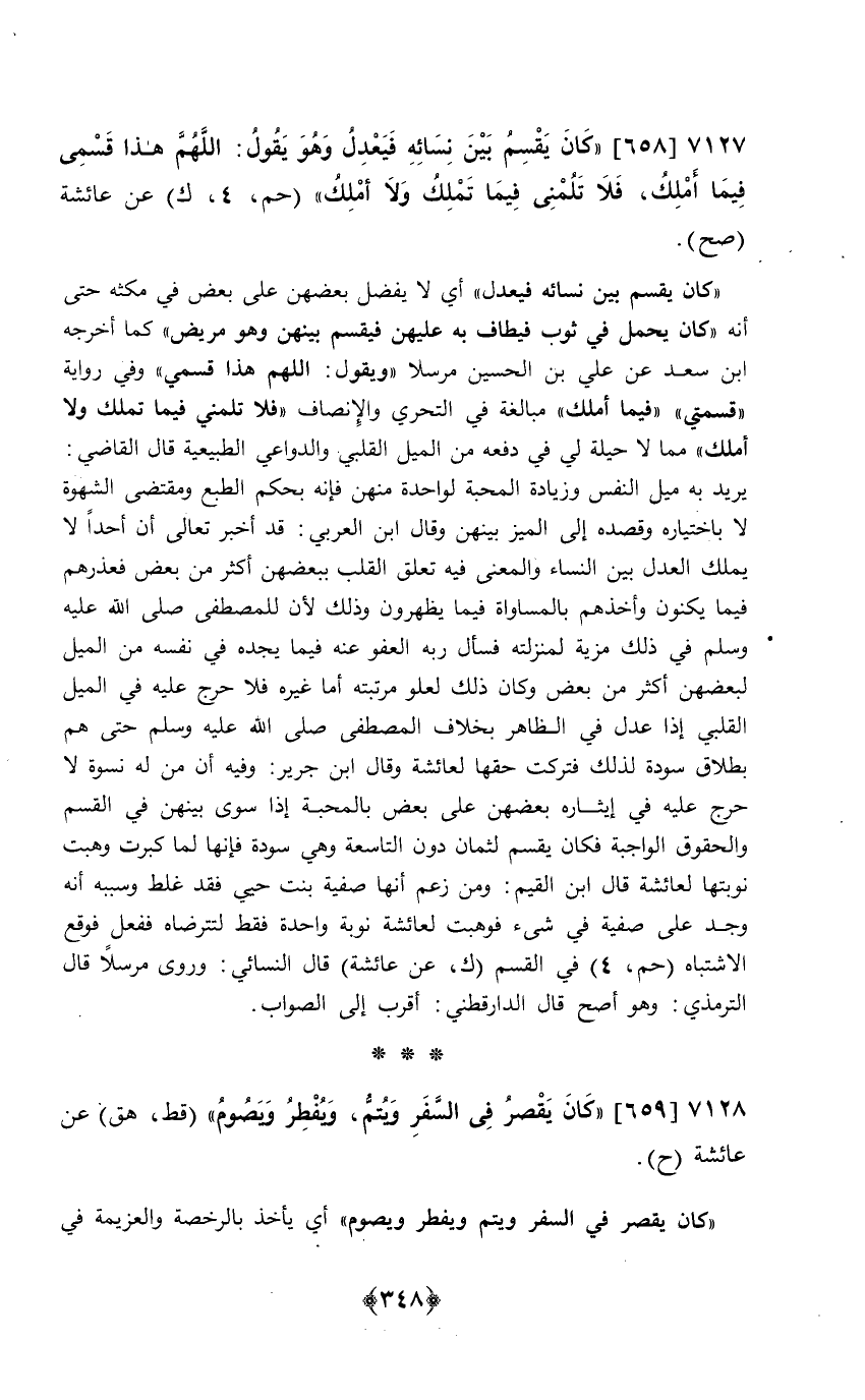 كَانَ يقسم بَين نِسَائِهِ فيعدل أَي لَا يفضل بَعضهنَّ على بعض فِي مكثه حَتَّى أَنه كَانَ يحمل فِي ثوب فيطاف بِهِ عَلَيْهِنَّ فَيقسم بَينهُنَّ وَهُوَ مَرِيض كَمَا أخرجه ابْن سعد عَن عَليّ بن الْحُسَيْن مُرْسلا وَيَقُول اللَّهُمَّ هَذَا قسمي وَفِي رِوَايَة قسمتي فِيمَا أملك مُبَالغَة فِي التَّحَرِّي والإنصاف فَلَا تلمني فِيمَا تملك وَلَا أملك مِمَّا لَا حِيلَة لي فِي دَفعه من الْميل القلبي والدواعي الطبيعية قَالَ القَاضِي يُرِيد بِهِ ميل النَّفس وَزِيَادَة الْمحبَّة لوَاحِدَة مِنْهُنَّ فَإِنَّهُ بِحكم الطَّبْع وَمُقْتَضى الشَّهْوَة لَا بِاخْتِيَارِهِ وقصده إِلَى الميز بَينهُنَّ وَقَالَ ابْن الْعَرَبِيّ قد أخبر تَعَالَى أَن أحدا لَا يملك الْعدْل بَين النِّسَاء وَالْمعْنَى فِي تعلق الْقلب ببعضهن أَكثر من بعض فعذرهم فِيمَا يكنون وَأَخذهم بالمساواة فِيمَا يظهرون وَذَلِكَ لِأَن الْمُصْطَفى صلى الله عَلَيْهِ وَسلم فِي ذَلِك مزية لمنزلته فَسَأَلَ ربه الْعَفو عَنهُ فِيمَا يجده فِي نَفسه من الْميل لبعضهن أَكثر من بعض وَكَانَ ذَلِك لعلو مرتبته أما غَيره فَلَا حرج عَلَيْهِ فِي الْميل القلبي إِذا عدل فِي الظَّاهِر بِخِلَاف الْمُصْطَفى صلى الله عَلَيْهِ وَسلم حَتَّى هم بِطَلَاق سَوْدَة لذَلِك فَتركت حَقّهَا لعَائِشَة وَقَالَ ابْن جرير وَفِيه أَن من لَهُ نسْوَة لَا حرج عَلَيْهِ فِي إيثاره بَعضهنَّ على بعض بالمحبة إِذا سوى بَينهُنَّ فِي الْقسم والحقوق الْوَاجِبَة فَكَانَ يقسم لثمان دون التَّاسِعَة وَهِي سَوْدَة فَإِنَّهَا لما كَبرت وهبت نوبتها لعَائِشَة قَالَ ابْن الْقيم وَمن زعم أَنَّهَا صَفِيَّة بنت حييّ فقد غلط وَسَببه أَنه وجد على صَفِيَّة فِي شَيْء فَوهبت لعَائِشَة نوبَة وَاحِدَة فَقَط لتترضاه فَفعل فَوَقع الِاشْتِبَاه حم 4 فِي الْقسم ك عَن عَائِشَة قَالَ النَّسَائِيّ وروى مُرْسلا قَالَ التِّرْمِذِيّ وَهُوَ أصح قَالَ الدَّارَقُطْنِيّ أقرب إِلَى الصَّوَاب