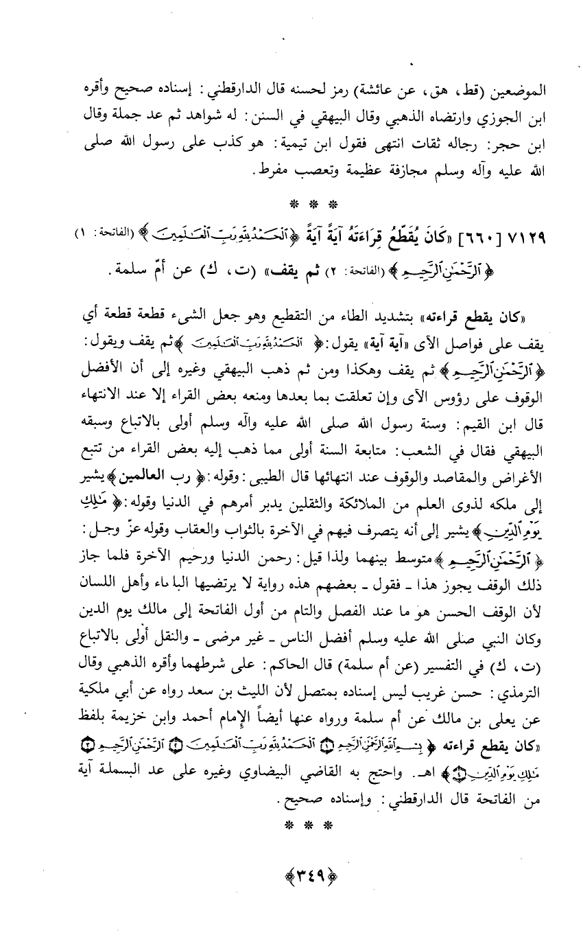 660 - (كَانَ يقطع قِرَاءَته آيَة آيَة {الْحَمد لله رب الْعَالمين} {الرَّحْمَن الرَّحِيم} ثمَّ يقف) ت ك عَن أم سَلمَة