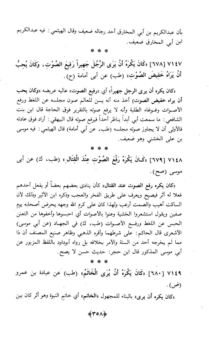 كَانَ يكره أَن يرى الرجل جهيرا أَي رفيع الصَّوْت عاليه عريضه وَكَانَ يحب أَن يرَاهُ خفيض الصَّوْت أَخذ مِنْهُ أَنه يسن للْعَالم صون مَجْلِسه عَن اللَّغط وَرفع الْأَصْوَات وغوغاء الطّلبَة وَأَنه لَا يرفع صَوته بالتقرير فَوق الْحَاجة قَالَ ابْن بنت الشَّافِعِي مَا سَمِعت أبي أبدا يناظر أحدا فيرفع صَوته قَالَ الْبَيْهَقِيّ أَرَادَ فَوق عَادَته فَالْأولى أَن لَا يُجَاوز صَوته مَجْلِسه طب عَن أبي أُمَامَة قَالَ الهيثمي فِيهِ مُوسَى بن عَليّ الْخُشَنِي وَهُوَ ضَعِيف