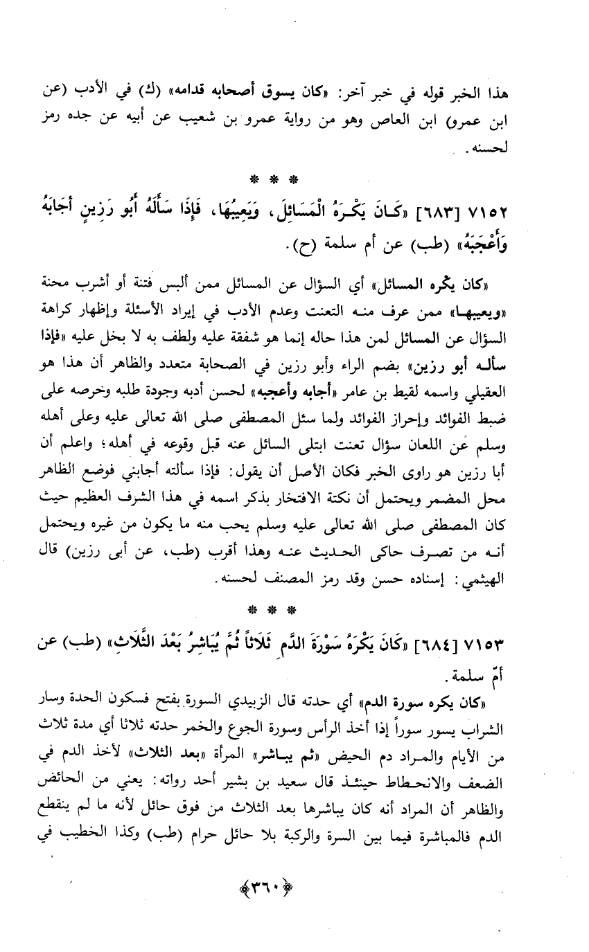 كَانَ يكره سُورَة الدَّم أَي حِدته قَالَ الزبيدِيّ السُّورَة بِفَتْح فَسُكُون الحدة وَسَار الشَّرَاب يسور سورا إِذا أَخذ الرَّأْس وَسورَة الْجُوع وَالْخمر حِدته ثَلَاثًا أَي مُدَّة ثَلَاث من الْأَيَّام وَالْمرَاد دم الْحيض ثمَّ يُبَاشر الْمَرْأَة بعد الثَّلَاث لأخذ الدَّم فِي الضعْف والانحطاط حِينَئِذٍ قَالَ سعيد بن بشير أحد رُوَاته يَعْنِي من الْحَائِض وَالظَّاهِر أَن المُرَاد أَنه كَانَ يُبَاشِرهَا بعد الثَّلَاث من فَوق حَائِل لِأَنَّهُ مَا لم يَنْقَطِع الدَّم فالمباشرة فِيمَا بَين السُّرَّة وَالركبَة بِلَا حَائِل حرَام طب وَكَذَا الْخَطِيب فِي
