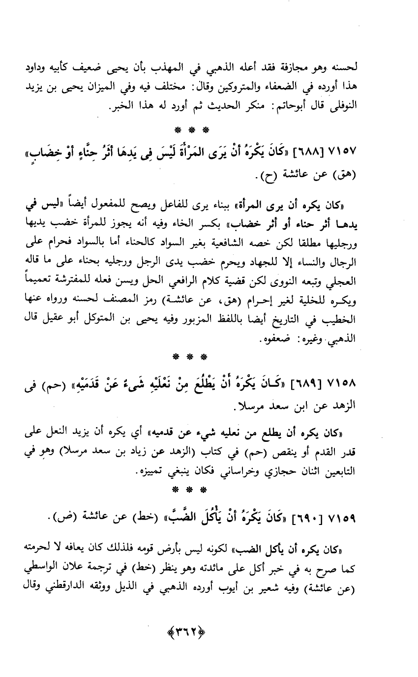 688 - (كَانَ يكره أَن يرى الْمَرْأَة لَيْسَ فِي يَدهَا أثر حناء أَو خضاب) هق عَن عَائِشَة ح