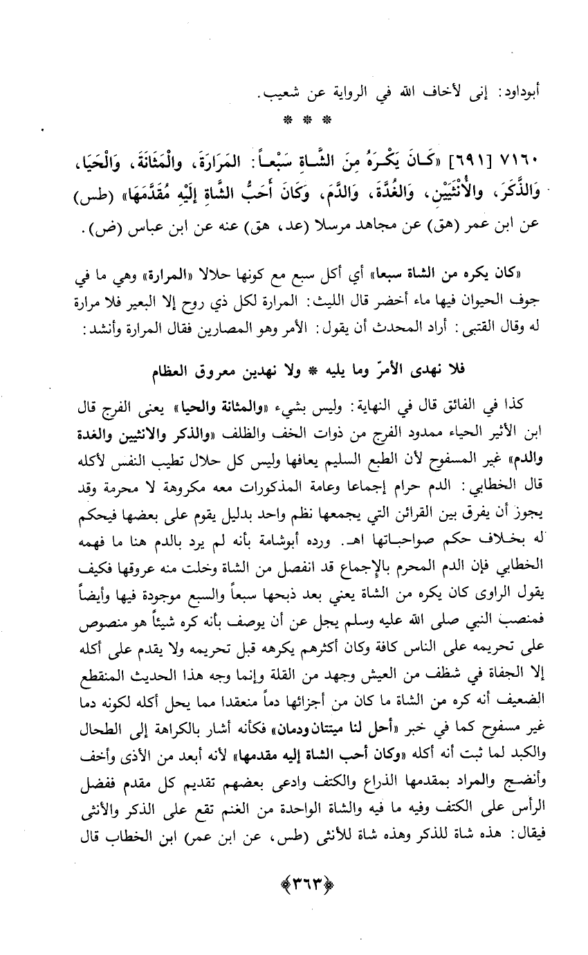 كَذَا فِي الْفَائِق قَالَ فِي النِّهَايَة وَلَيْسَ بِشَيْء والمثانة والحيا يَعْنِي الْفرج قَالَ ابْن الْأَثِير الْحيَاء مَمْدُود الْفرج من ذَوَات الْخُف والظلف وَالذكر والانثيين والغدة وَالدَّم غير المسفوح لِأَن الطَّبْع السَّلِيم يعافها وَلَيْسَ كل حَلَال تطيب النَّفس لأكله قَالَ الْخطابِيّ الدَّم حرَام إِجْمَاعًا وَعَامة الْمَذْكُورَات مَعَه مَكْرُوهَة لَا مُحرمَة وَقد يجوز أَن يفرق بَين الْقَرَائِن الَّتِي يجمعها نظم وَاحِد بِدَلِيل يقوم على بَعْضهَا فَيحكم لَهُ بِخِلَاف حكم صواحباتها اه ورده أَبُو شامة بِأَنَّهُ لم يرد بِالدَّمِ هُنَا مَا فهمه الْخطابِيّ فَإِن الدَّم الْمحرم بِالْإِجْمَاع قد انْفَصل من الشَّاة وخلت مِنْهُ عروقها فَكيف يَقُول الرواي كَانَ يكره من الشَّاة يَعْنِي بعد ذَبحهَا سبعا والسبع مَوْجُودَة فِيهَا وَأَيْضًا فمنصب النَّبِي صلى الله عَلَيْهِ وَسلم يجل عَن أَن يُوصف بِأَنَّهُ كره شَيْئا هُوَ مَنْصُوص على تَحْرِيمه على النَّاس كَافَّة وَكَانَ أَكْثَرهم يكرههُ قبل تَحْرِيمه وَلَا يقدم على أكله إِلَّا الجفاة فِي شظف من الْعَيْش وَجهد من الْقلَّة وَإِنَّمَا وَجه هَذَا الحَدِيث الْمُنْقَطع الضَّعِيف أَنه كره من الشَّاة مَا كَانَ من أَجْزَائِهَا دَمًا منعقدا مِمَّا يحل أكله لكَونه دَمًا غير مسفوح كَمَا فِي خبر أحل لنا ميتَتَانِ وَدَمَانِ فَكَأَنَّهُ أَشَارَ بِالْكَرَاهَةِ إِلَى الطحال والكبد لما ثَبت أَنه أكله وَكَانَ أحب الشَّاة إِلَيْهِ مقدمها لِأَنَّهُ أبعد من الْأَذَى وأخف وأنضج وَالْمرَاد بمقدمها الذِّرَاع والكتف وَادّعى بَعضهم تَقْدِيم كل مقدم ففضل الرَّأْس على الْكَتف وَفِيه مَا فِيهِ وَالشَّاة الْوَاحِدَة من الْغنم تقع على الذّكر وَالْأُنْثَى فَيُقَال هَذِه شَاة للذّكر وَهَذِه شَاة للْأُنْثَى طس عَن ابْن عمر ابْن الْخطاب قَالَ
