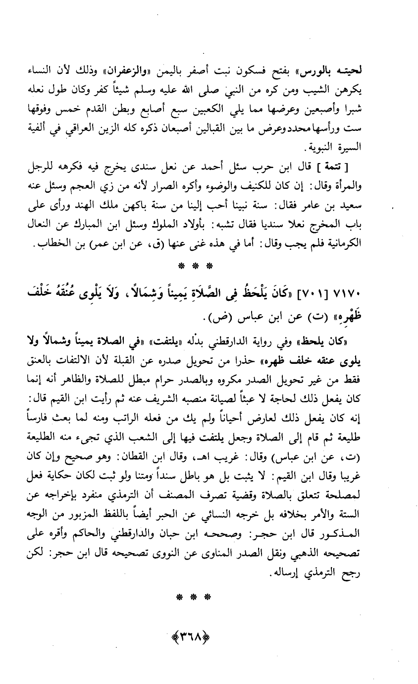 70 - (كَانَ يلحظ فِي الصَّلَاة يَمِينا وَشمَالًا وَلَا يلوي عُنُقه خلف ظَهره) ت عَن ابْن عَبَّاس ض